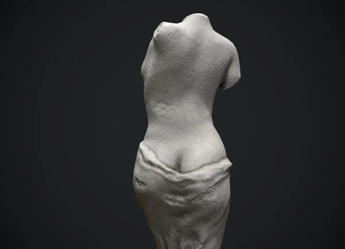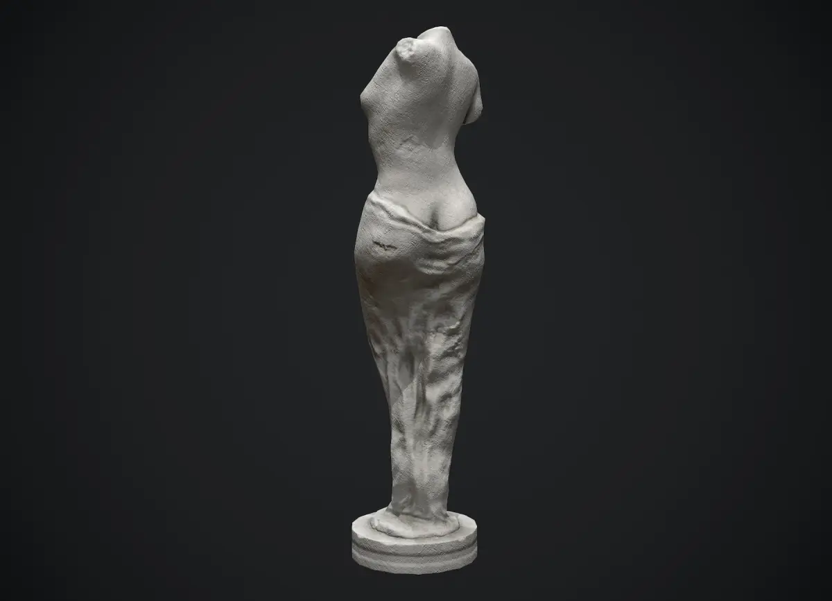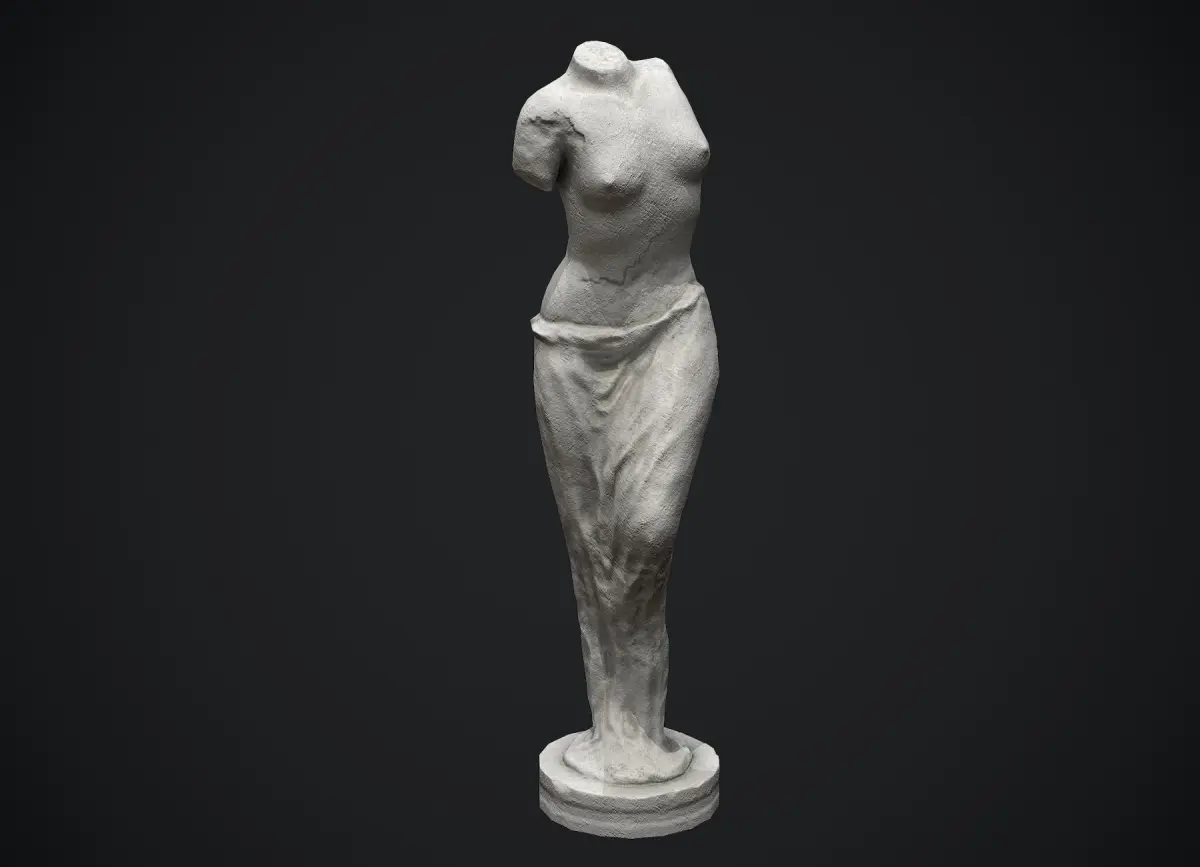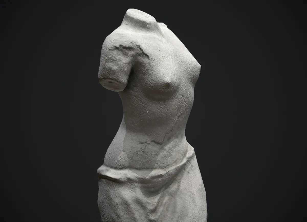 Nude woman torso limestone sculpture prop for games and realtime apps. Original fictional concept sculpture, not real world historical art piece. This prop is great to be used as a smaller scale decoration object but also a larger sculpture in historical or classic art setting.