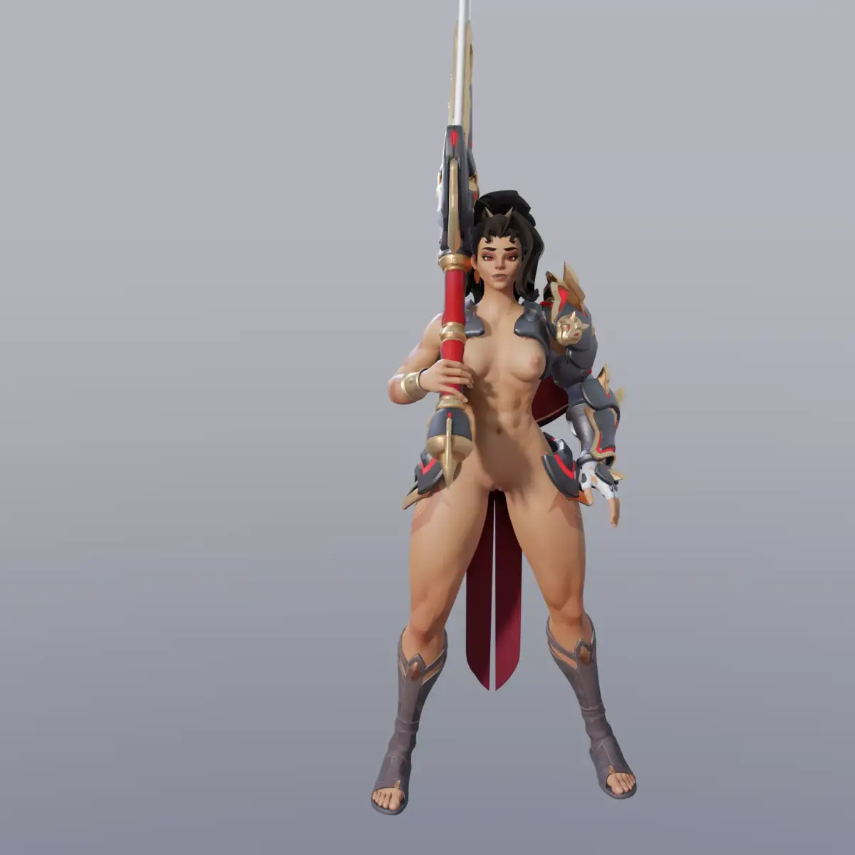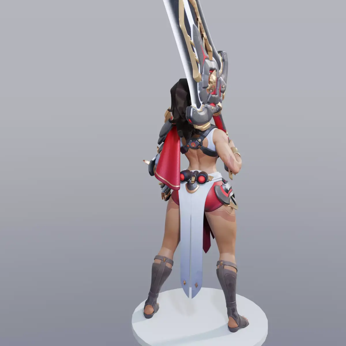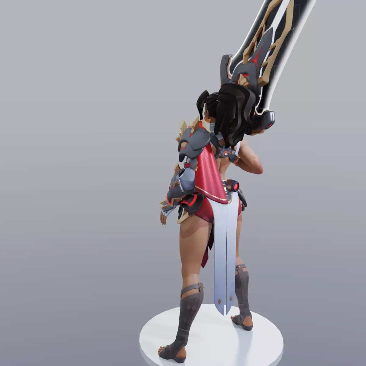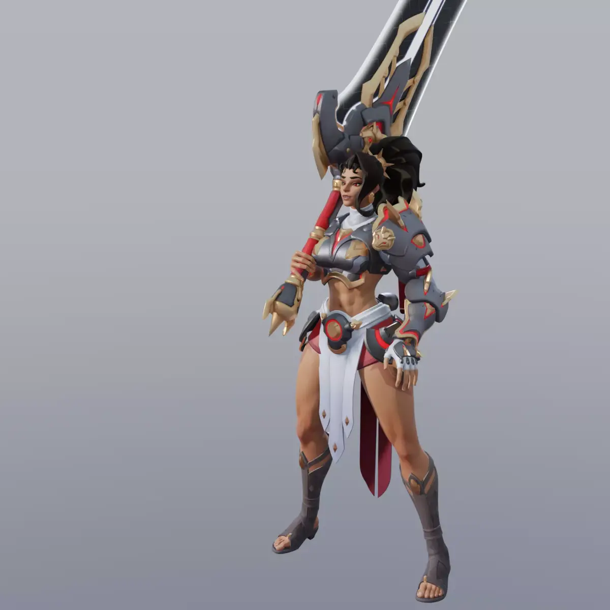 This 3D character model depicts a strong, confident warrior woman styled in a fantasy-meets-sci-fi aesthetic. She carries an oversized, ornate sword resting across her shoulders, its design featuring layered metallic plating, gold accents, and angular futuristic detailing. Her outfit blends armor and cloth elements—sleek pauldrons, bracers, and a stylized chest piece paired with a white and red cloth tabard. Her stance is grounded yet relaxed, emphasizing athletic legs and a powerful build. The character's expression and posture convey readiness and determination, while the overall design combines elegance, strength, and heroism in a polished, game-ready rendering.