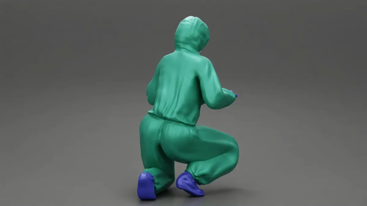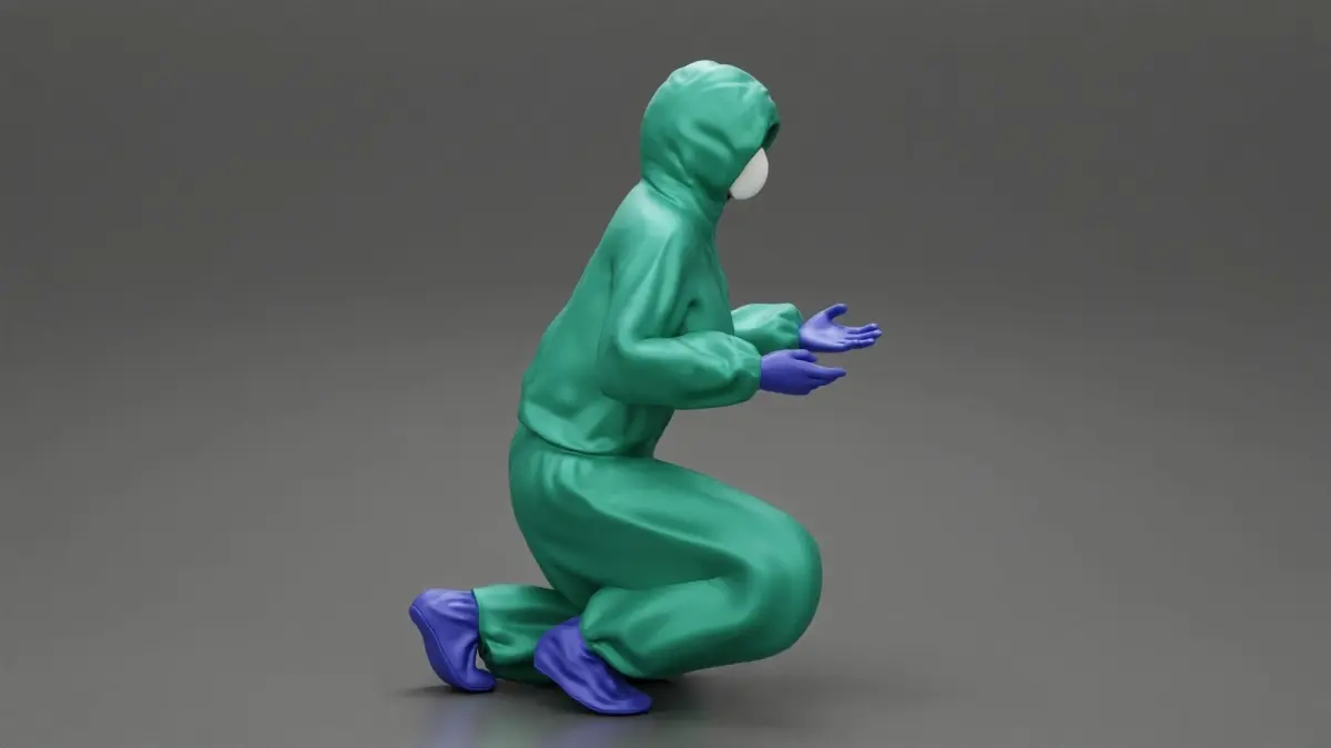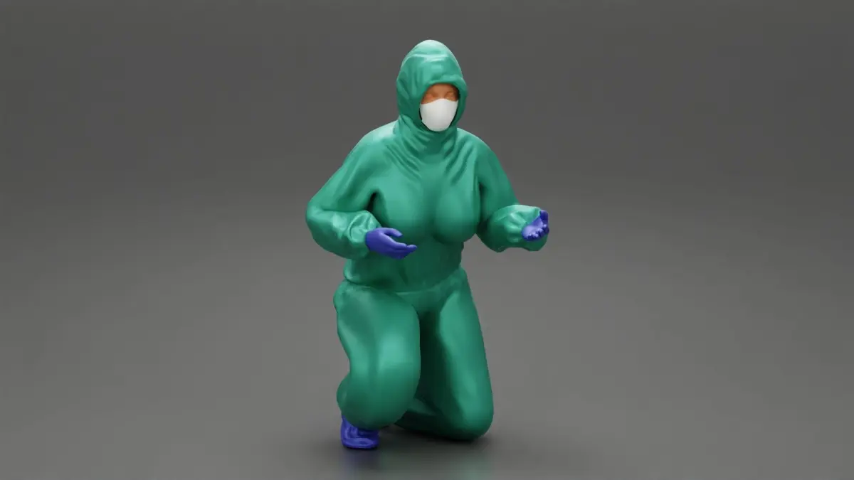 Home Catalog woman wearing antivirus suit sitting and carrying 3D print model