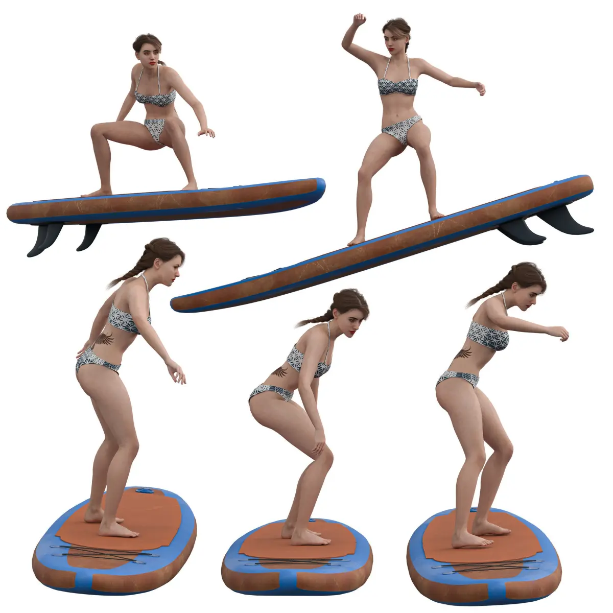 Name: Woman with Paddle Board 05 PosesType: modelFormat: 3Ds Max 2013Export: FBX, OBJRender: VRay (5.x), Corona (6)Polys: 260046Verts: 389369Matclasses: Multimaterial,VRayMtl,CoronaMtlUnits: CentimetersDimension: 418.6 x 579.49 x 372.22Date: 2025.7.16Packinfo: Packed with Model Packer by https://3dground.net/Packver: 1.9.3Description:This high-quality 3D model of a woman surfing on a paddle board is ideal for animation, game development, advertising, and VR/AR experiences. The character is presented in multiple active poses, showcasing fluid body movement and realistic swimwear design. The paddle board features detailed modeling and optimized topology for smooth integration in real-time engines.