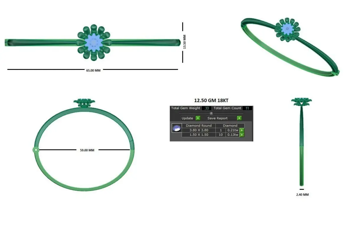 Design Master11provides solutions for cad, render, catalogue and model view for diamond jewellery designs. If you want any changes in this design please contact us, I will get back to you within 5-8 hours. This type of bracelet may be called as a bangle or bangle bracelet. I have tried to show the size of the bracelet in the picture, less thickness bracelet called as a thin bracelet and others called as thick bracelet. This is a women bracelet, who prefer to wear this in the wedding, engagement or in family function. I generally have flower bracelet, heart bracelet, leaf bracelet and broad bracelet which you can directly purchase or if you have your design in your mind, just share an idea, we will start working on it.