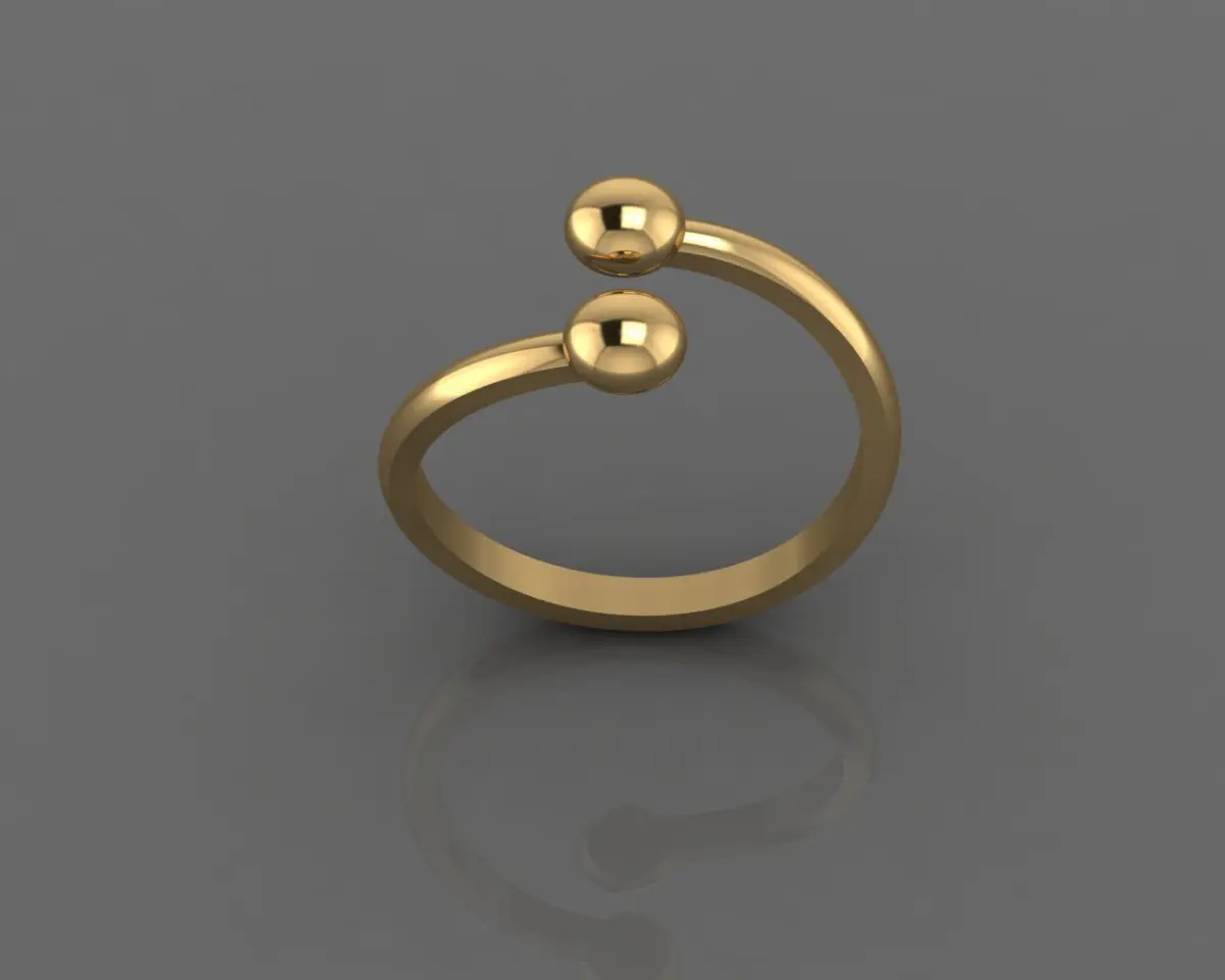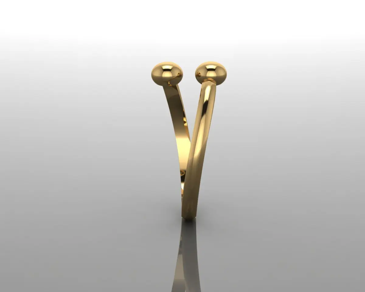 This elegant ring, featuring a minimalist and open-ended design, embodies the essence of meaningful simplicity and understated beauty. Two polished golden spheres sit gently at the open ends of the band, approaching one another without ever touching—like a silent dialogue between two balanced points.