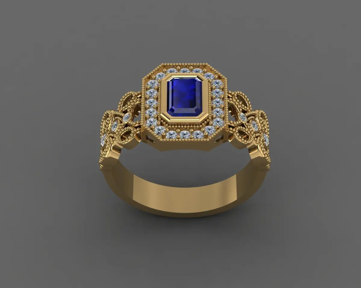 This stunning creation masterfully blends classic nobility with luxurious detail. Its defining feature is the deep blue emerald-cut centerpiece, surrounded by a halo of brilliant white stones—evoking the image of a royal gem glowing among stars.