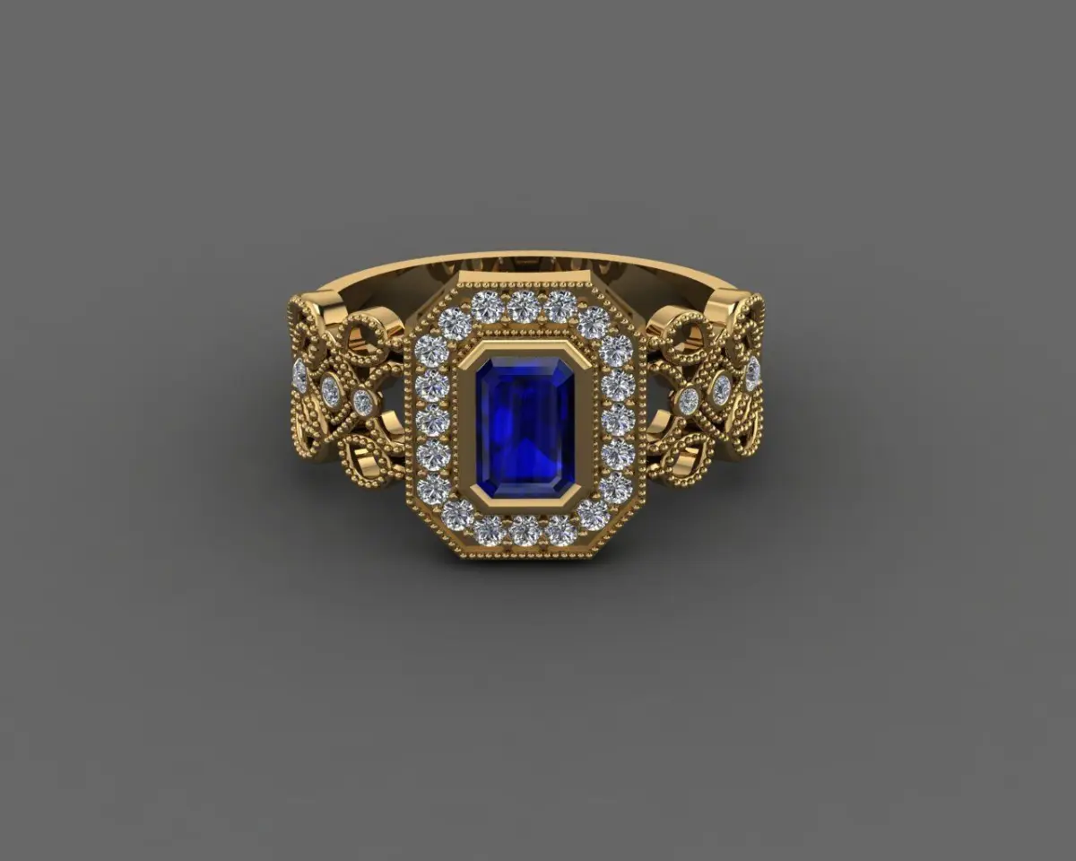This stunning creation masterfully blends classic nobility with luxurious detail. Its defining feature is the deep blue emerald-cut centerpiece, surrounded by a halo of brilliant white stones—evoking the image of a royal gem glowing among stars.