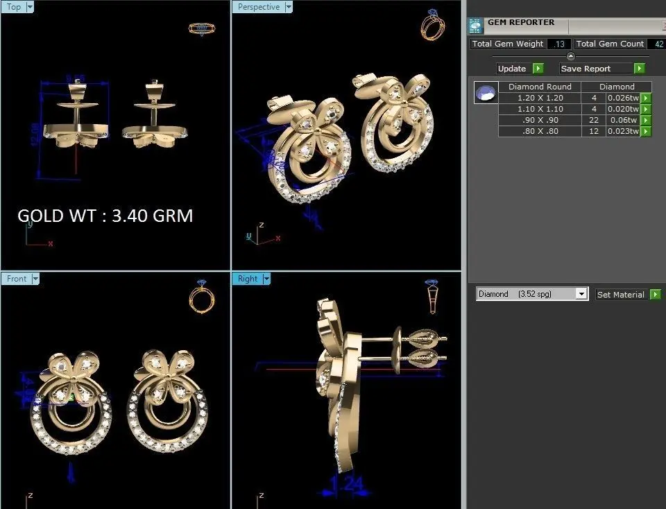 Design Master11provides solutions for cad, render, catalogue and model view for diamond jewellery designs. If you want any changes in this design please contact us, I will get back to you within 5-8 hours. This type of earring maybe called solitaire earring, stud earring, drop earring or halo earring. You can change the stone to round, emerald, heart, pear, princess so the earring will be called as round tone earring, emerald earring, heart earring, pear earring, and princess earring respectively.I have uploaded a render image of the product but you can change the color of stone as per your convenience. For example, if you don’t like the diamond earring, so you can add a red stone for the ruby earring, green stone for the emerald earring, yellow stone for citrin earring, blue stone for the sapphire earring. This is a complete fashion earring which you can wear in your everyday life. You can check some of the most famous earring: oval earring and flower earring