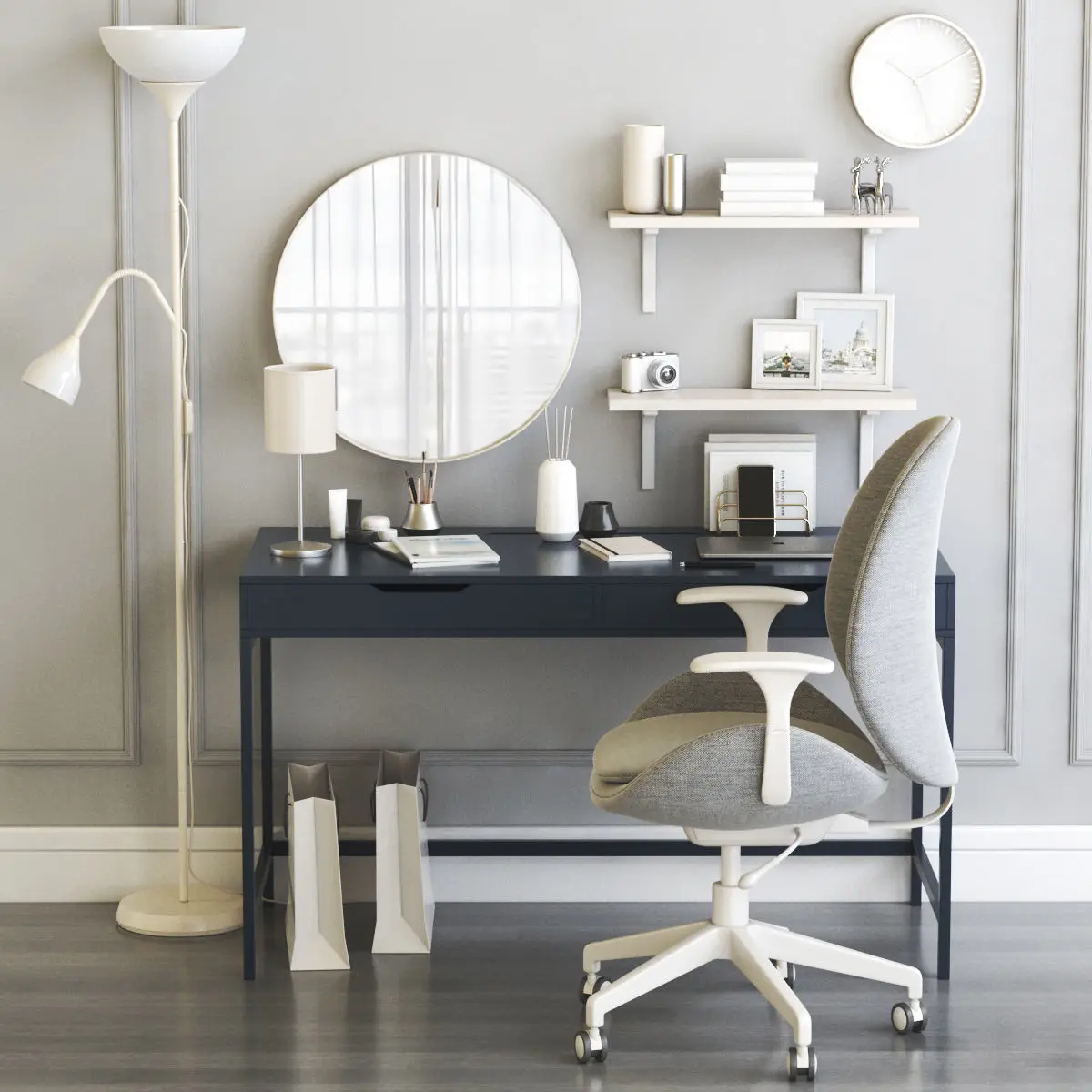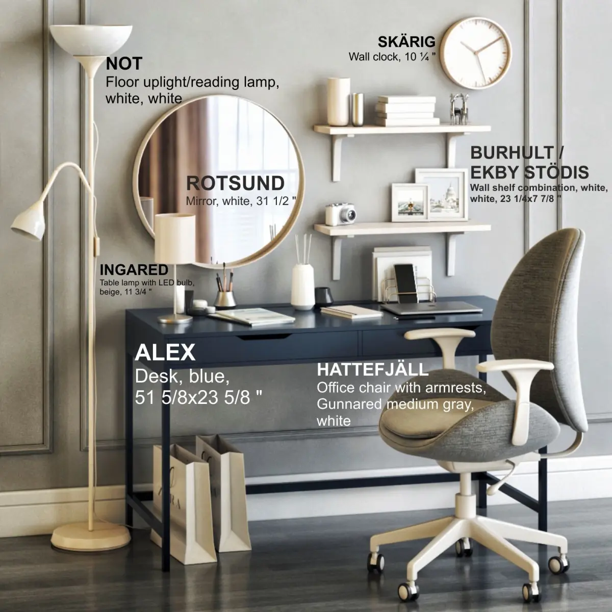 - ALEX Desk, blue, 51 5/8x23 5/8.The perfect combination of sleek design and practical details such as a cord compartment and spacious drawers. The same finish on all sides allows you to place the table not only against the wall, but also in the center of the room. Built-in compartment for wires; the wires are hidden, but always at hand. Thanks to the stoppers, the drawer does not fall out of the frame.