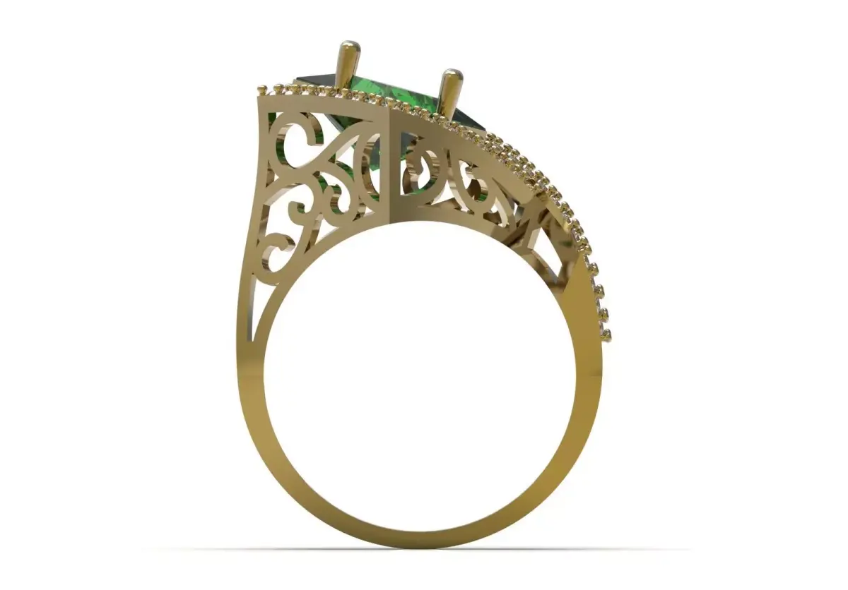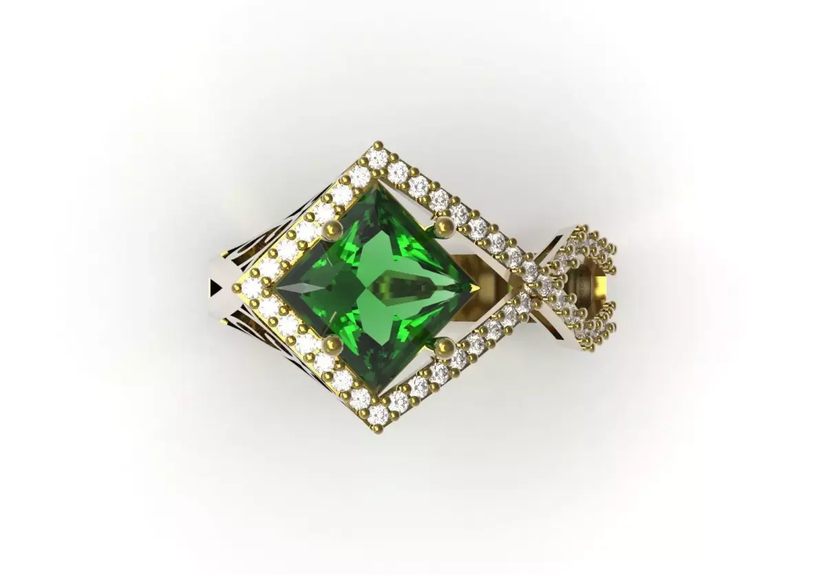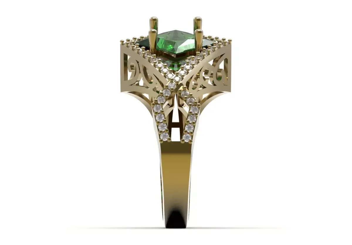 Overall structure: A ring model with wide shoulders and a scroll/Fleur-de-lis design on the sides, ending in a square/cushion-shaped top.