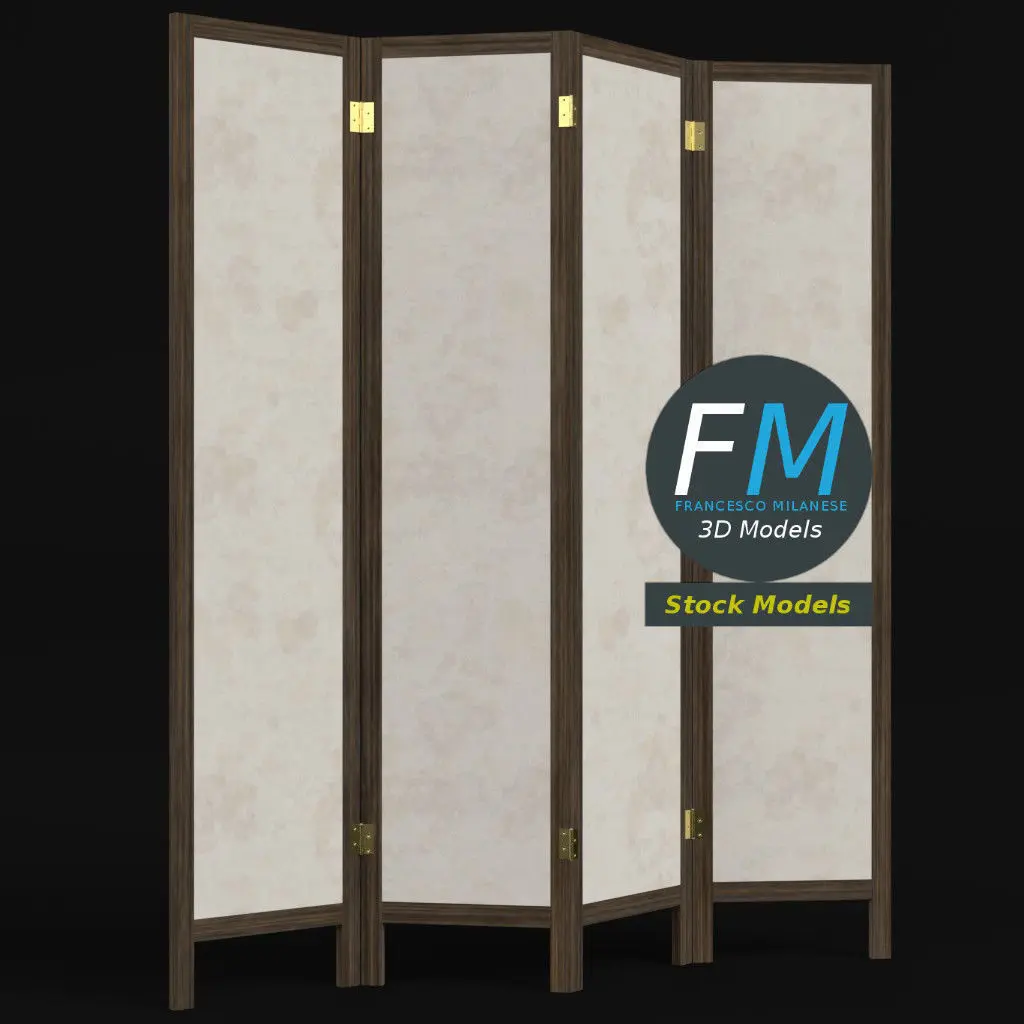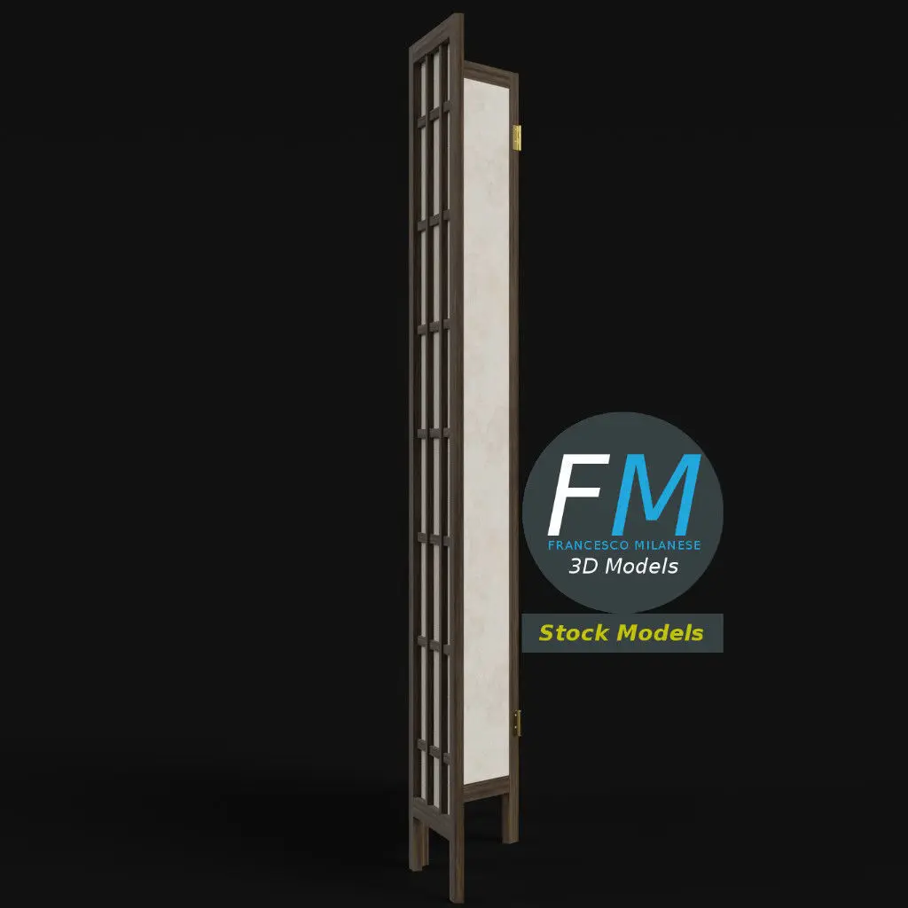 Wood and paper (rice paper, japanese shoji style) room divider 3D Model. 4 individual objects (each wing has its hinge properly placed, so you can easily rotate or even animate them), sharing the same non overlapping UV Layout map, Material and PBR Textures set. Production-ready 3D Model, with PBR materials, textures, non overlapping UV Layout map provided in the package.