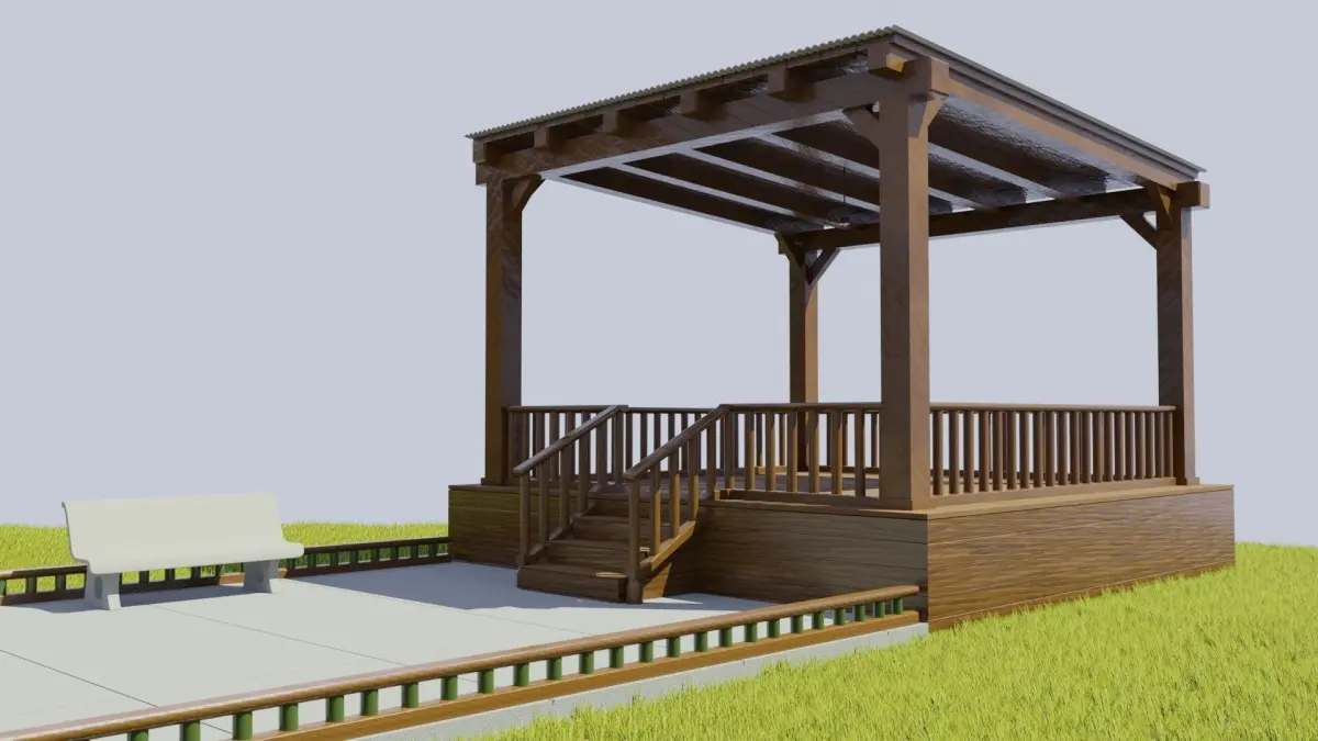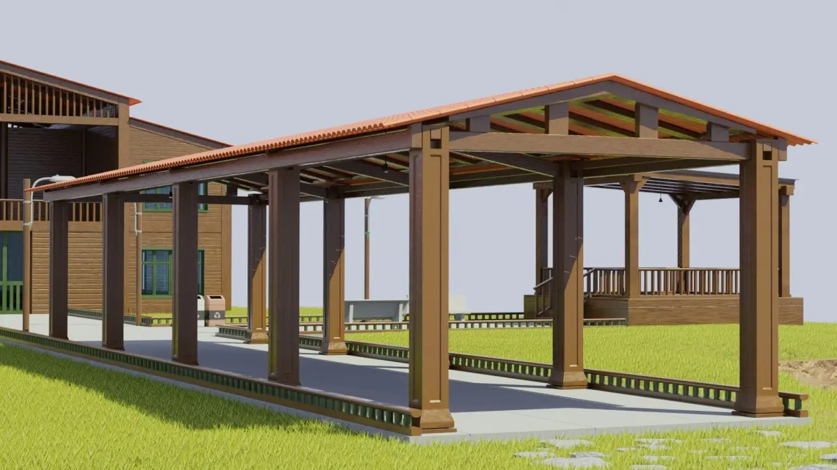 This is a model of wooden buildings composed of poles, lights, lawn, entrance, bandstand, tea house and lodge.