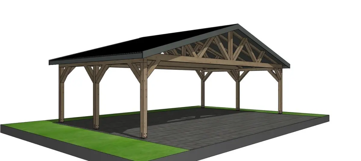 carport 6x9m in the outline of the roof. Made on 6 wooden poles with fastenings to the foundation - steel anchors with screws. Lightweight structure, roof and shingle as one surface.16 degree roof with metal panelOn this model You can see more details than on many others - construction is made as ready to build and park Your design cars