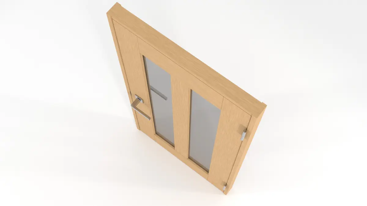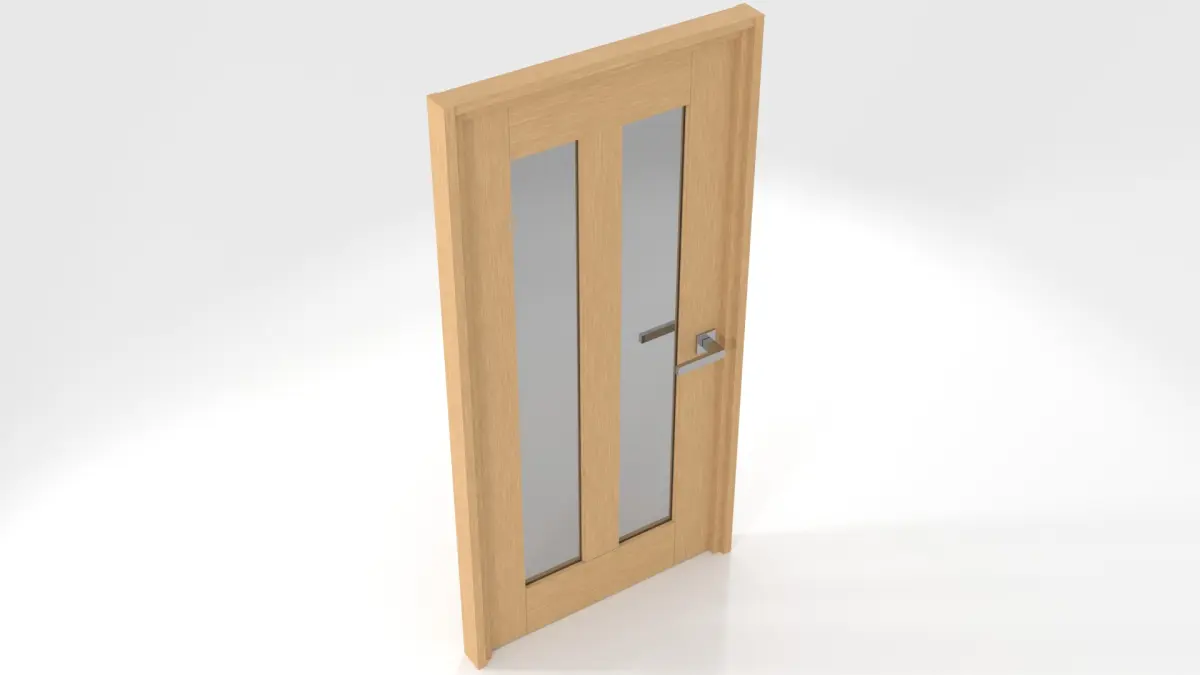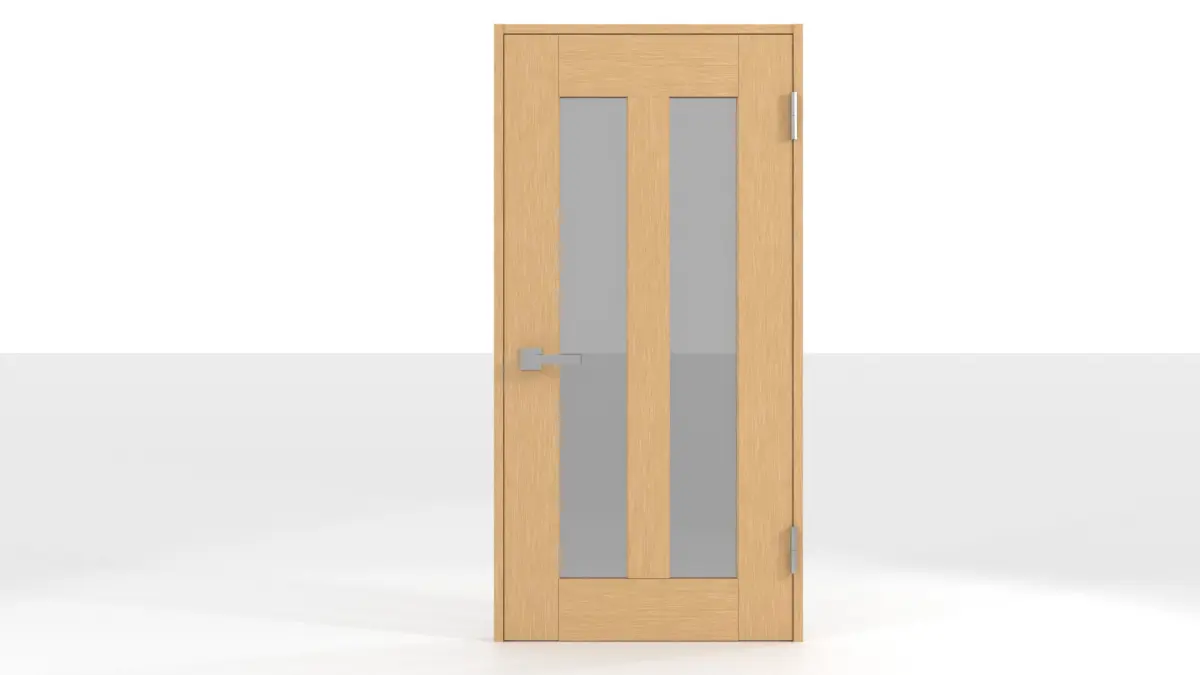This is a modern wooden door with a frosted glass window. Dimensions: Approximately W100 x D20 x H200 cm