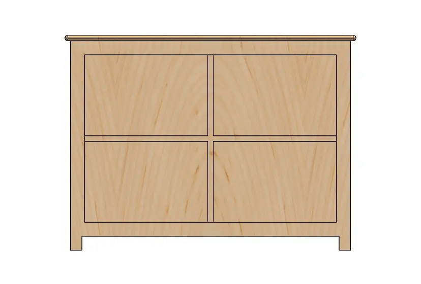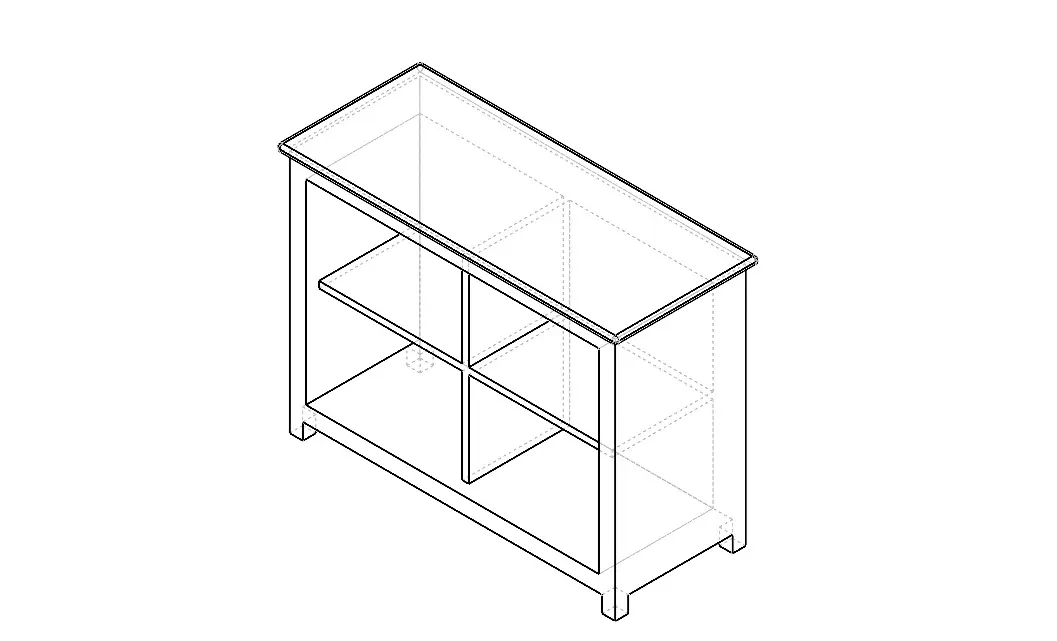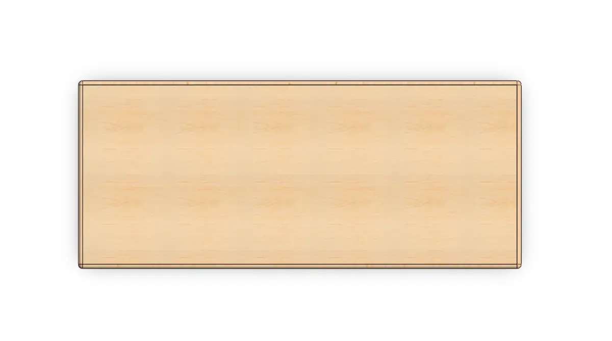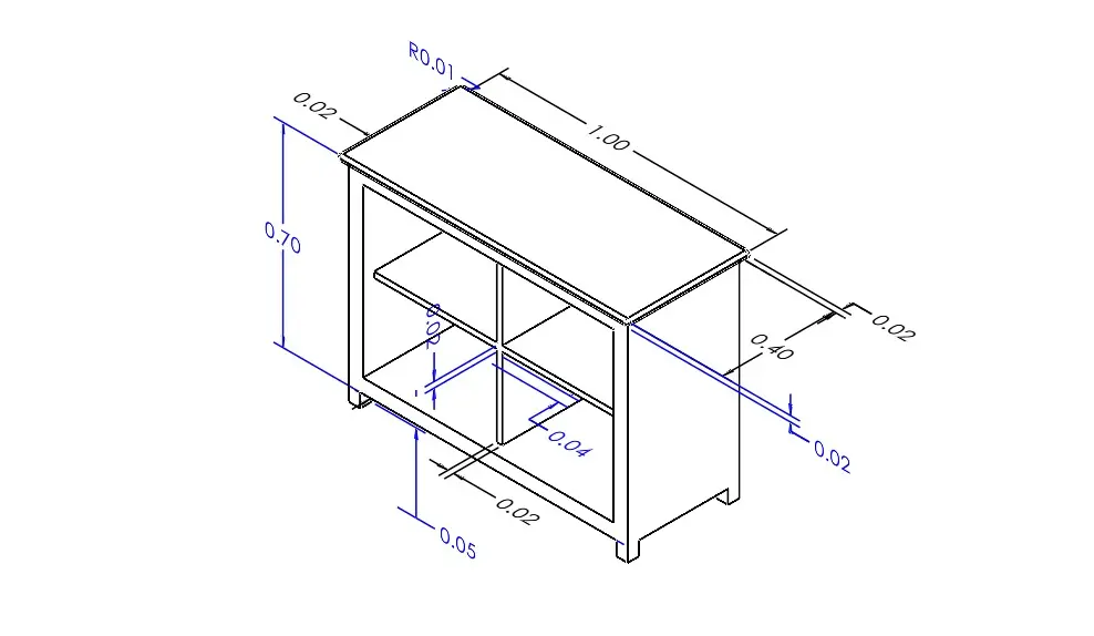 This SolidWorks 3D model presents a straightforward shelving unit crafted from maple wood, featuring four compartments. The design includes a rectangular top surface supported by four vertical legs, with two horizontal shelves dividing the space into equal sections. The natural wood grain texture of maple enhances the model's realism. All measurements are provided in meters, and it's recommended to use SolidWorks 2023 for optimal compatibility and functionality.
