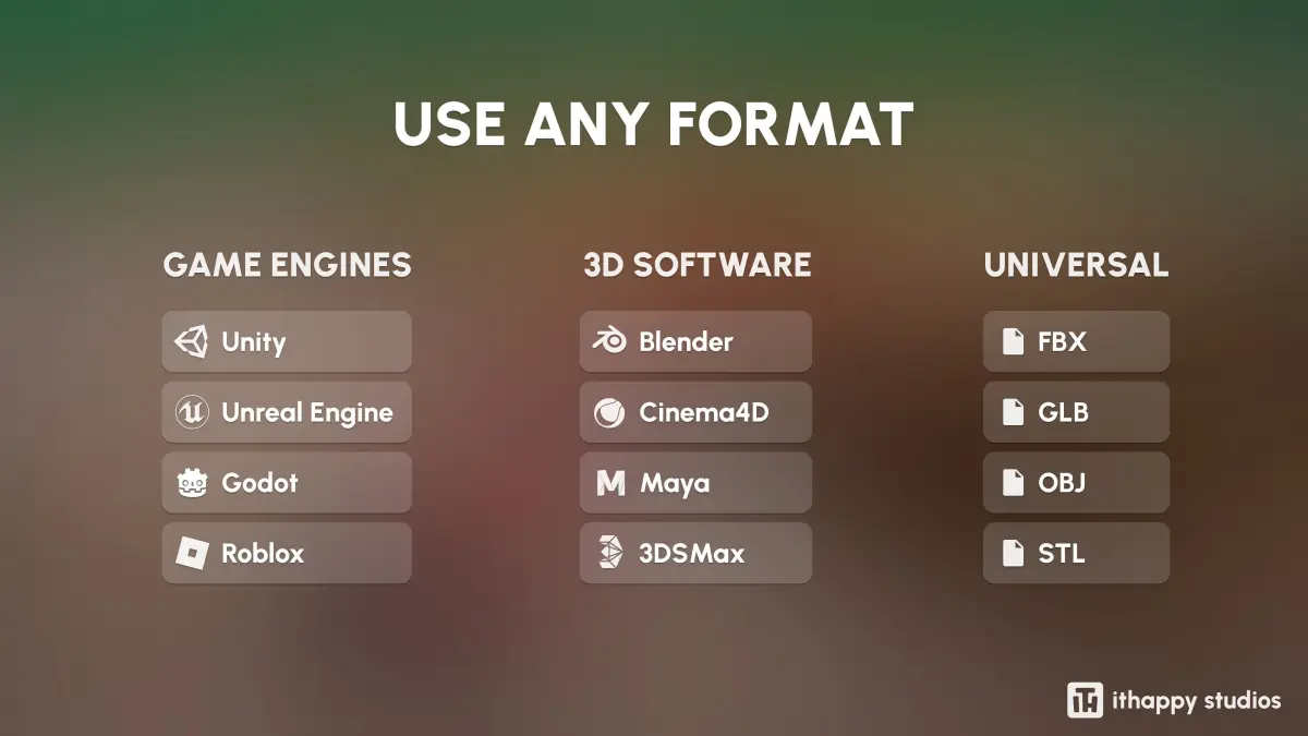 FILESYou’ll be able to download formats such as Unity Package, UE, Blender, C4D, Maya, 3DSMax, FBX, OBJ, GLTF, and STL.