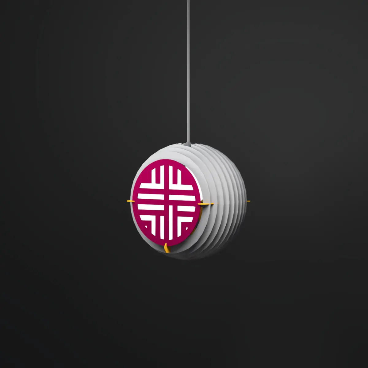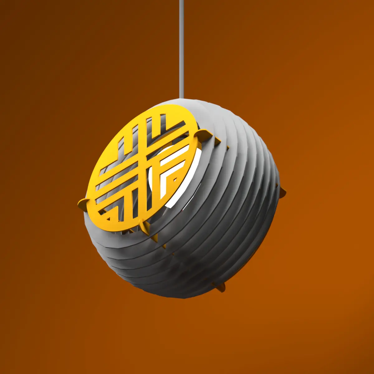 contemporary, spherical pendant light fixture. This fixture is made up of several concentric, white, circular layers that form a globe-like shape. The front of the light fixture features an intricate, geometric pattern that resembles a mandala or snowflake. This design allows light to pass through, creating captivating shadows and light patterns.