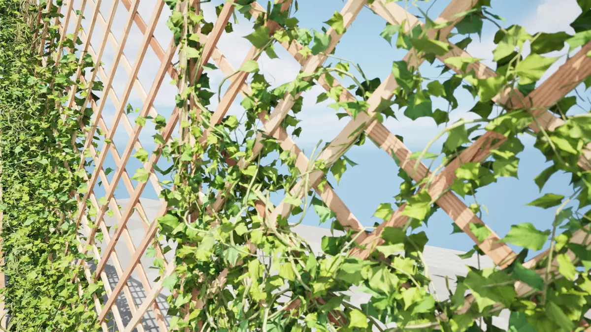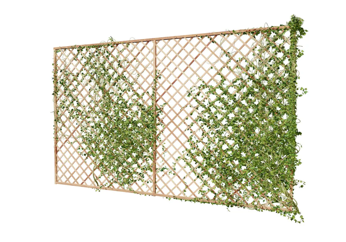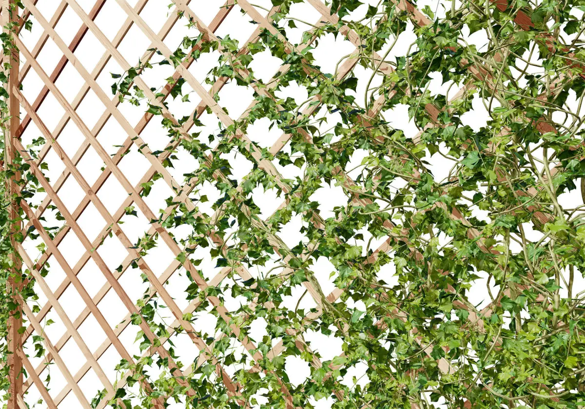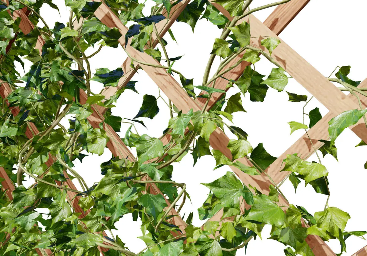 highly detailed 3d collection of wood mesh with ivy climber, this 3D model features a lush green ivy climber plant that has been carefully grown and trained to grow up a wall-mounted wood mesh. The ivy leaves are detailed and lifelike, and the overall effect is very realistic. This model is perfect for adding a touch of nature to any scene.