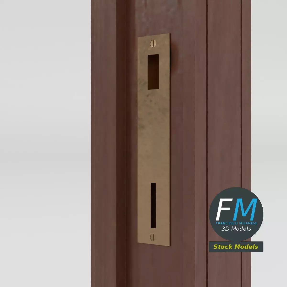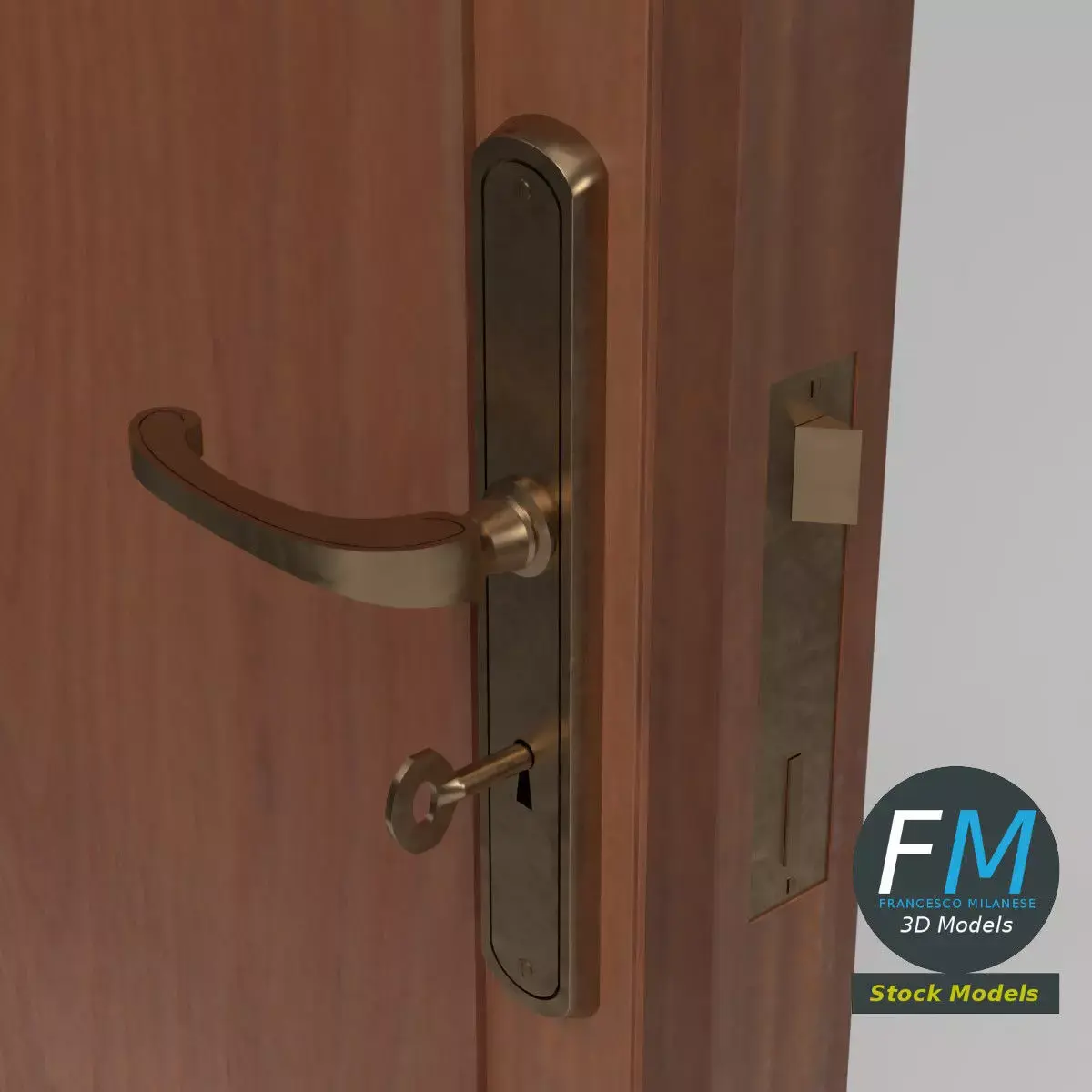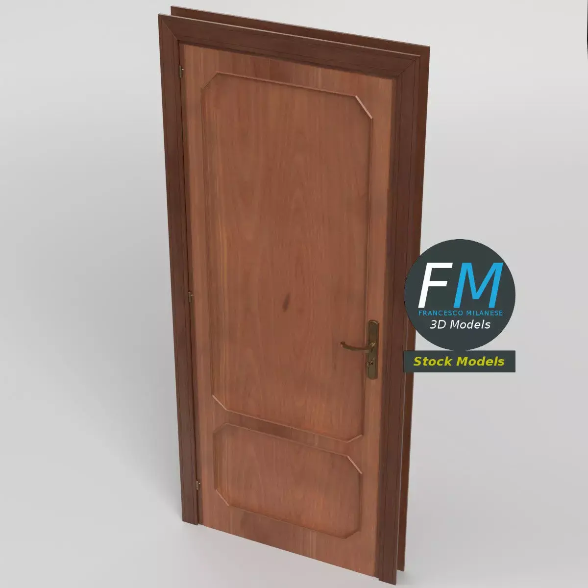 High-quality wooden interior door 3D Model featuring a classic double-panel design, warm natural wood grain, and metal handle with keyhole, ideal for residential architectural visualization and interior scenes. 8 individual objects (1 frame, 2 casings, 1 panel, 1 key, 1 handles, 1 latch, 1 deadbolt), sharing the same non overlapping UV Layout Map and 2 Materials (wood, metal) and PBR Textures sets. Production-ready 3D Model with non overlapping UV Layout map provided in the package. PBR Materials and Textures (Metallic Workflow: Base Color, Metallic, Roughness, Normal) embedded in the Blend, FBX, and GLB files.Easily customizable: UV unwrapped geometries; UV Layout maps provided in the package as png with alpha images.Quads-only geometry.Made with Blender 5.0.1 with Cycles Principled BSDF (PBR, Metallic Workflow) Material, then exported to other formats (OBJ, FBX, GLB; FBX and GLB have embedded textures).Promo images: some renderings made with Cycles for Blender, plus Wireframes and Blender screenshots (Object Mode, Edit Mode with UVs).Formats included: FBX with embedded PBR Textures (Metallic Workflow: Base Color, Metallic, Roughness, Normal), GLB with embedded PBR Textures (Metallic Workflow: Base Color, Metallic, Roughness, Normal), OBJ; scenes: BLEND (with Cycles Principled (PBR) Materials); other: 16-bit PNGs with Alpha.8 Objects (meshes), 2 PBR Materials, UV unwrapped (non overlapping UV Layout map provided in the package).UV Layout maps and Image Textures resolutions: 2048x2048.Polygonal, QUADS-ONLY, 13946 vertices, 13453 quad faces (26906 tris).Real world dimensions; scene scale units: METERS in Blender 5.0.1 (that is: Metric with 1.00 scale).Uniform scale object (scale applied in Blender 5.0.1).PBR Textues included: in a zipped folder, you'll find the PBR Textures set (as 16-bit PNGs with Alpha).IMPORTANT --- Main renderings made with Blender 5.0.1 + Cycles using an HDR Environment Texture Image which is NOT provided in the package!