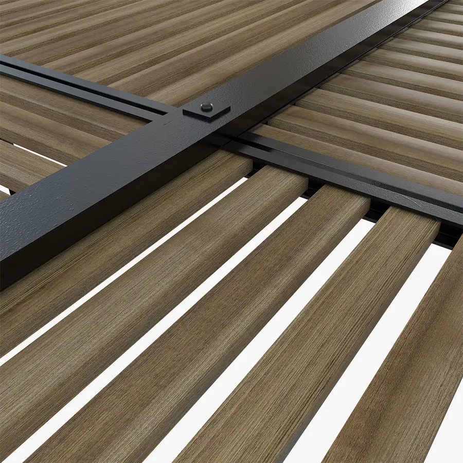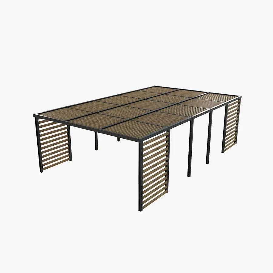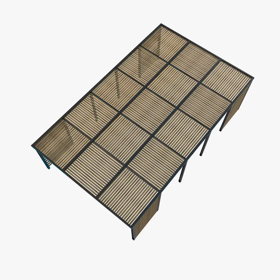 Wood sunshade with metal skeleton.Excellent quality polygons without triangles and intersections. The elements are grouped. High detail of the fasteners: bolts, gaskets, rivets.Dimensions 2500h x 8500L mm (98,4252h x 334,646L inch)pol: 28470vert: 24728