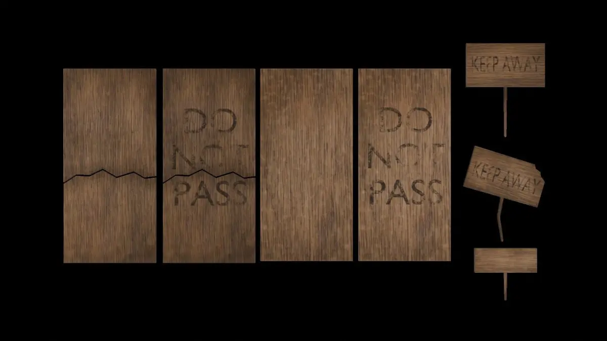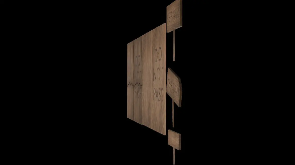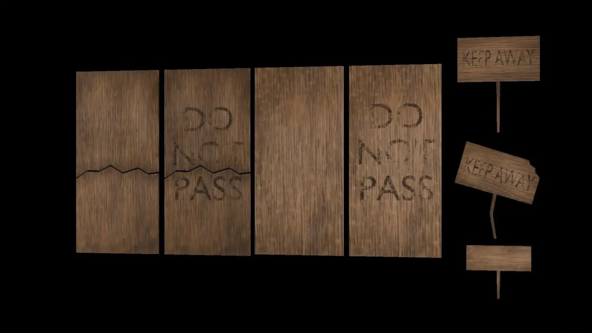 Los modelos 3D son carteles y tablas de estilo simple y legible que contienen los mensajes Keep away y Do not pass. Están diseñados con un bajo conteo de polígonos para garantizar un rendimiento eficiente en el motor del videojuego, lo que los hace ideales para utilizar en entornos con múltiples elementos. Las texturas son claras y nítidas, con una apariencia llamativa para asegurar que los mensajes sean visibles y fáciles de entender dentro del juego. Los assets están optimizados para ser utilizados en diferentes entornos y situaciones, manteniendo la legibilidad y el impacto visual en diversas condiciones de iluminación y escala. Estos modelos 3D añaden un toque de realismo y ambientación al entorno del videojuego, proporcionando indicaciones claras para la jugabilidad y la inmersión del jugador.