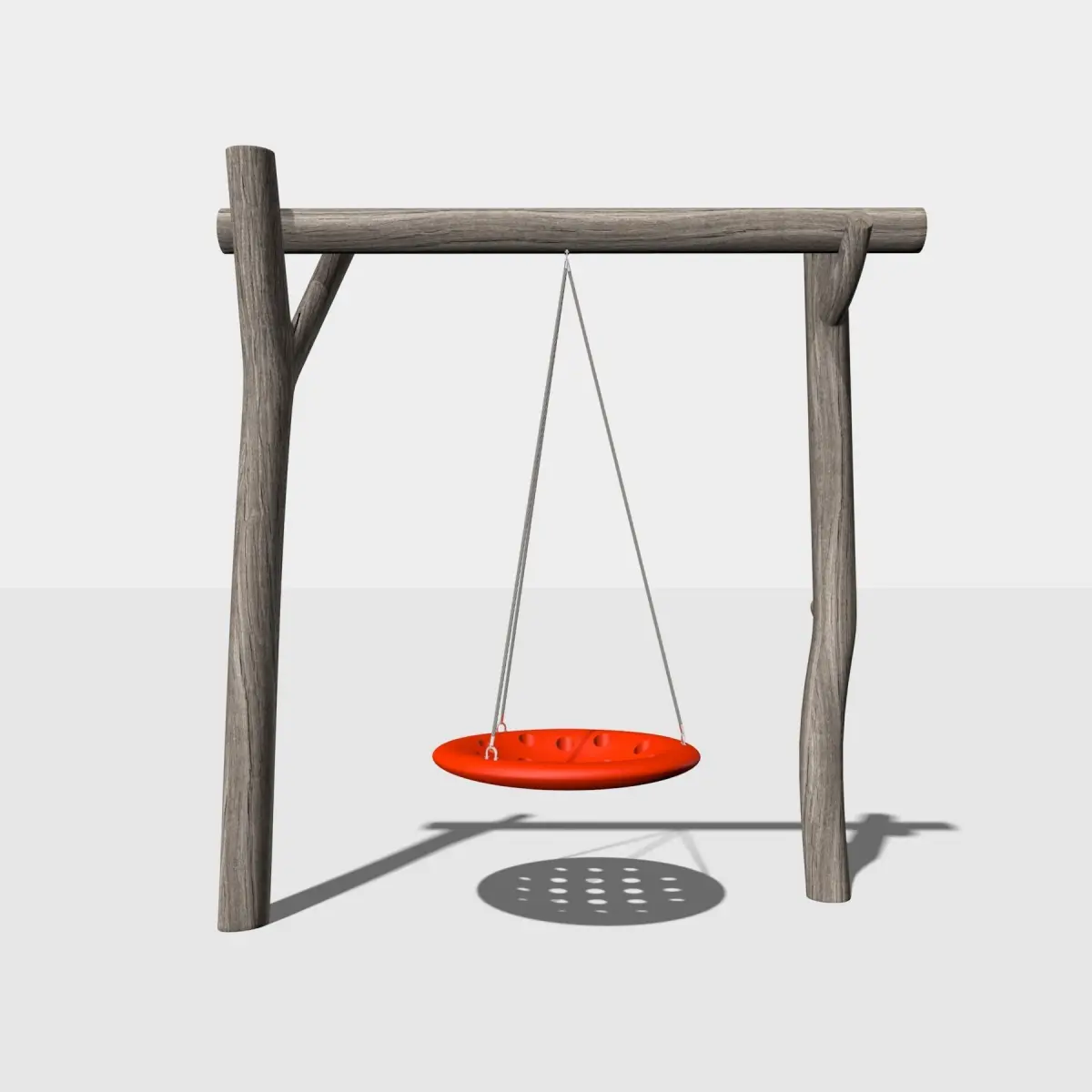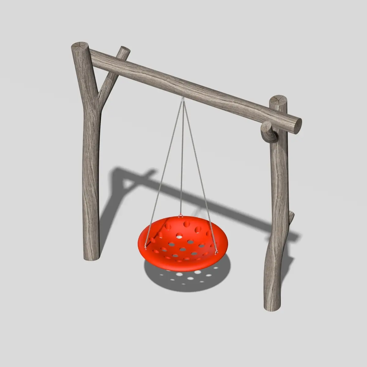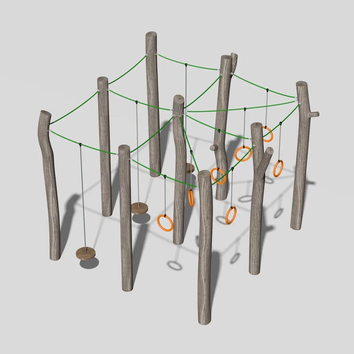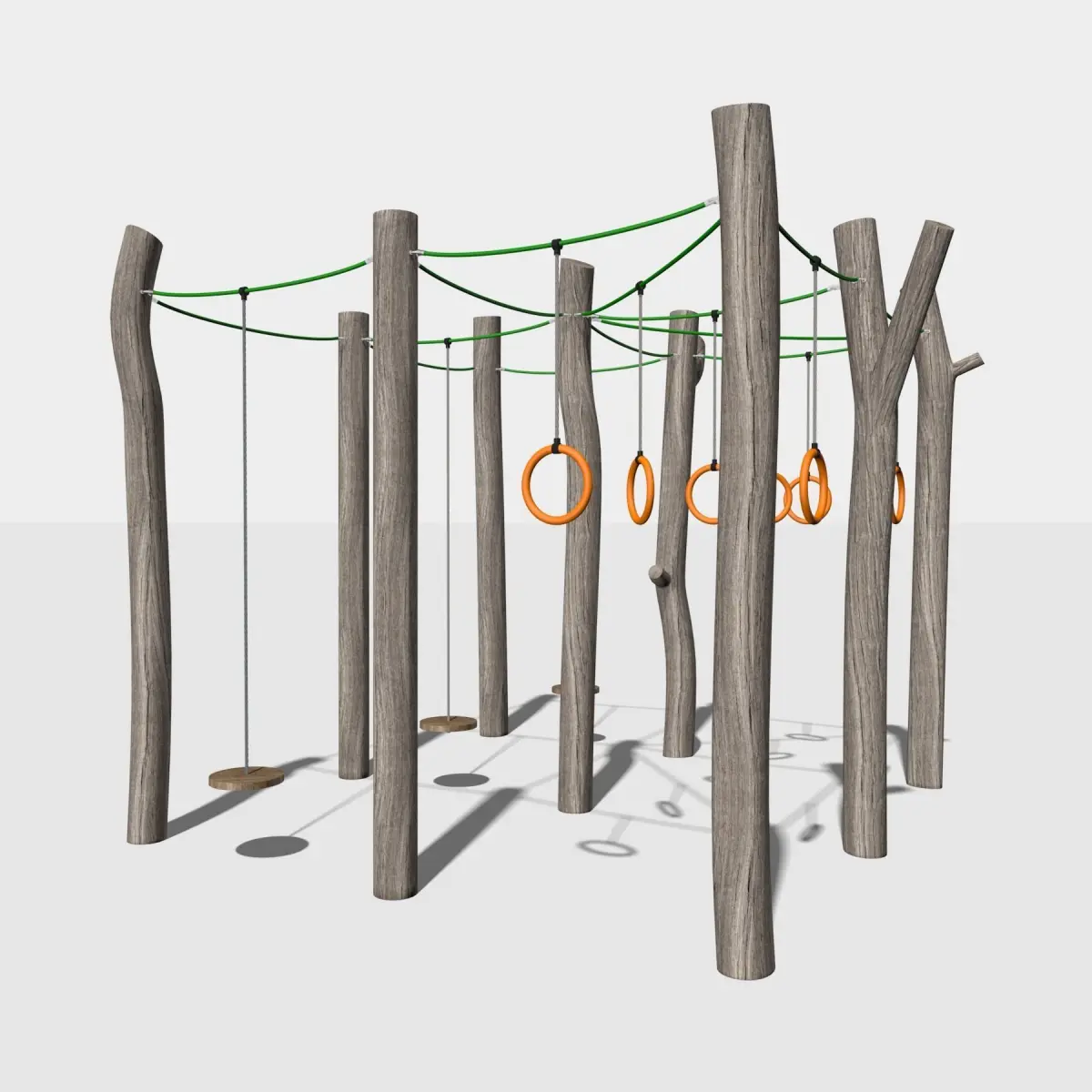 Children's playground made of solid wooden elements.The combination of natural materials, plastic and metal.The platform consists of five elements: a pyramid, a swing, a turnstile, a handle and a walkway.