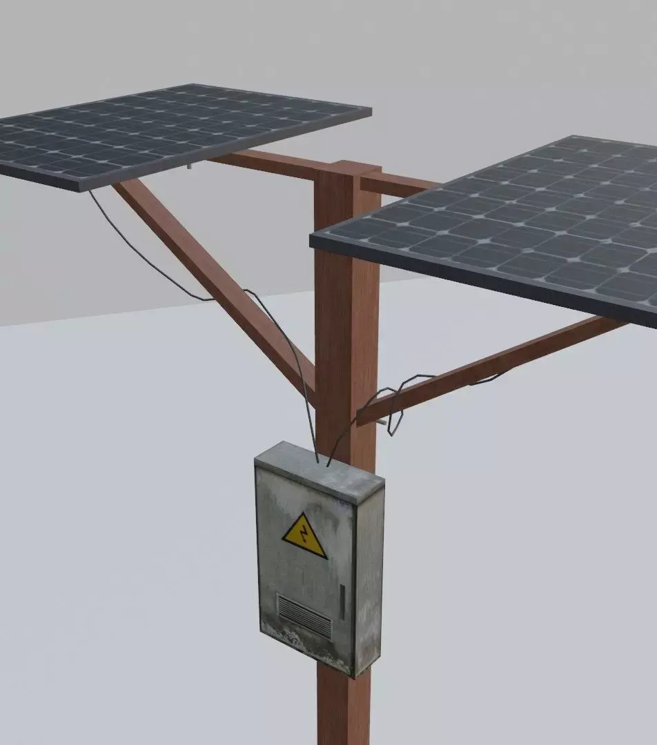 Description:This is a realistic 3D model of a wooden solar-powered street lamp, designed with a modern yet natural look. The lamp post is made of wood material combined with solar panels and a power control box, making it perfect for architectural visualization, urban design, outdoor scenes, and game environments.