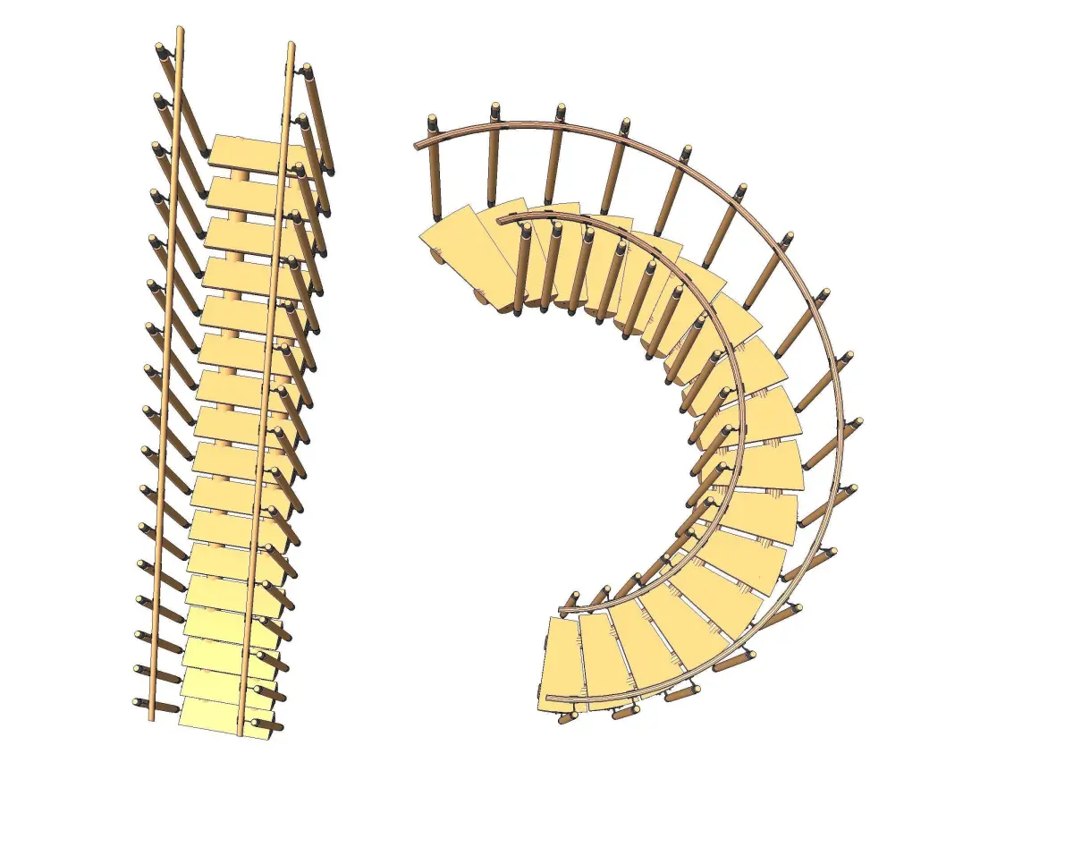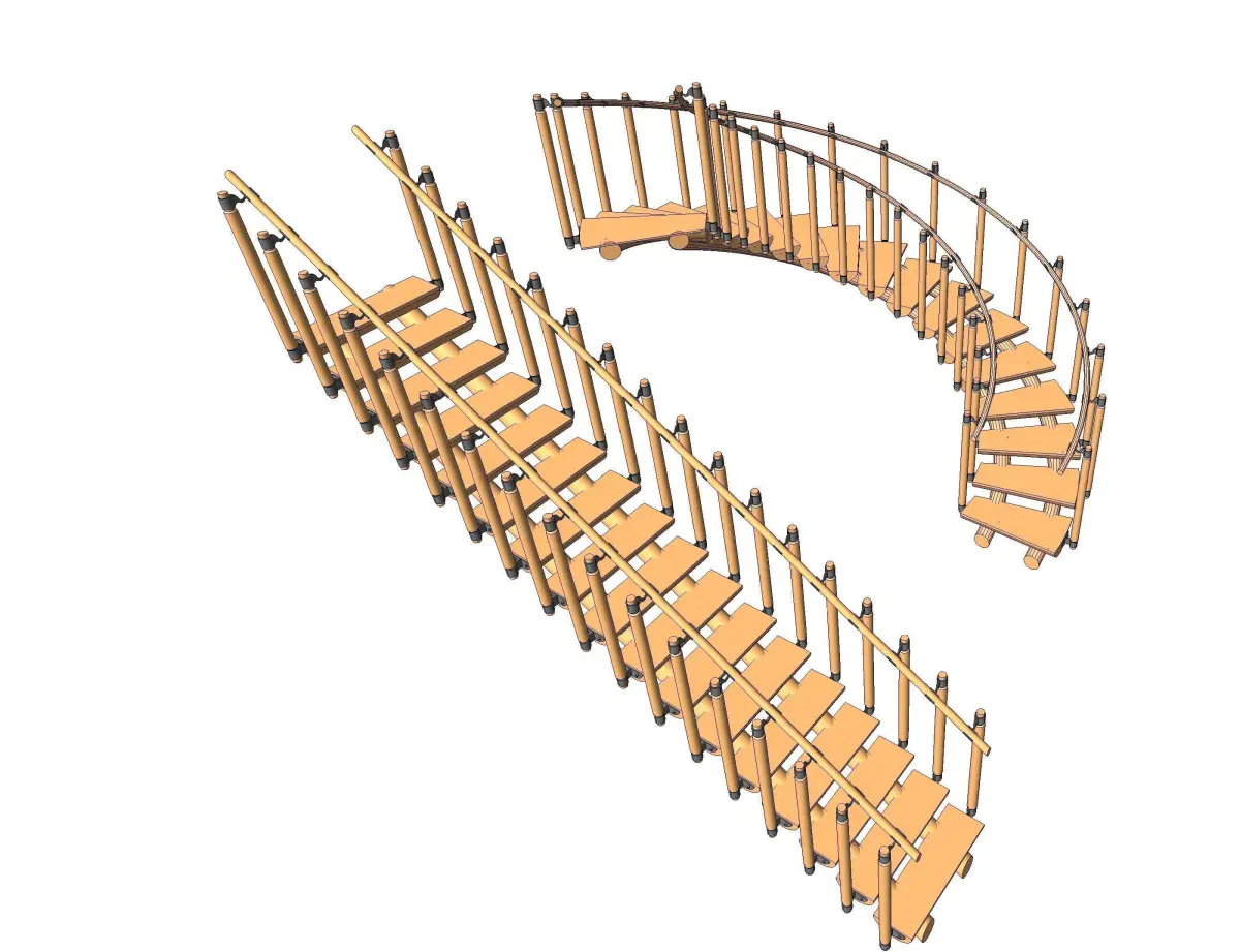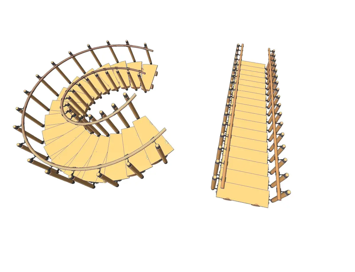 Revit modeling of a staircase with a wood structure. The stair rises to a height of 10' (approx 3mts), width of 3' (0.9mts approx)