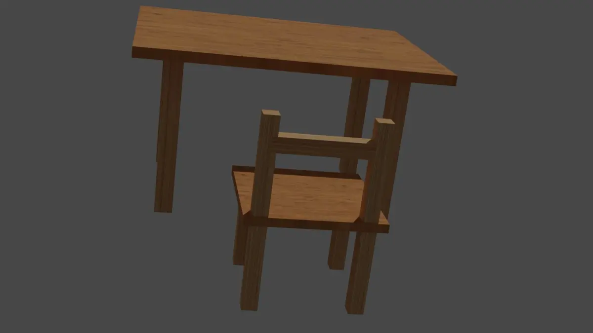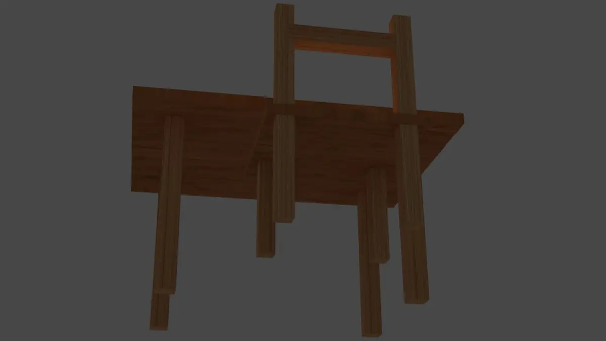 Wood table and wood chair formate file(fbx, obj, blend), the number of faces is 66, vertics 88, tris 132,material is light wood, model is low poly and game-ready.Made in blender