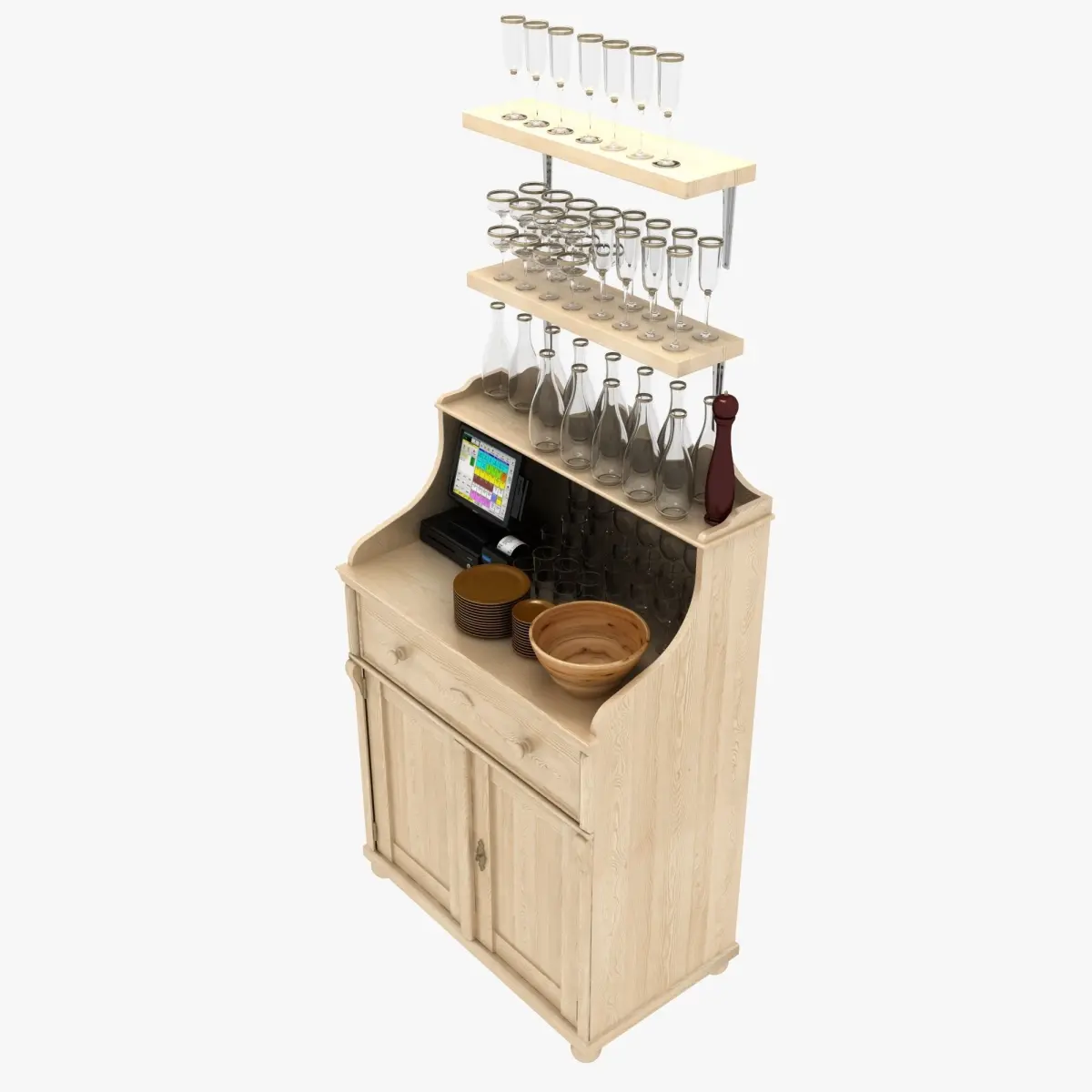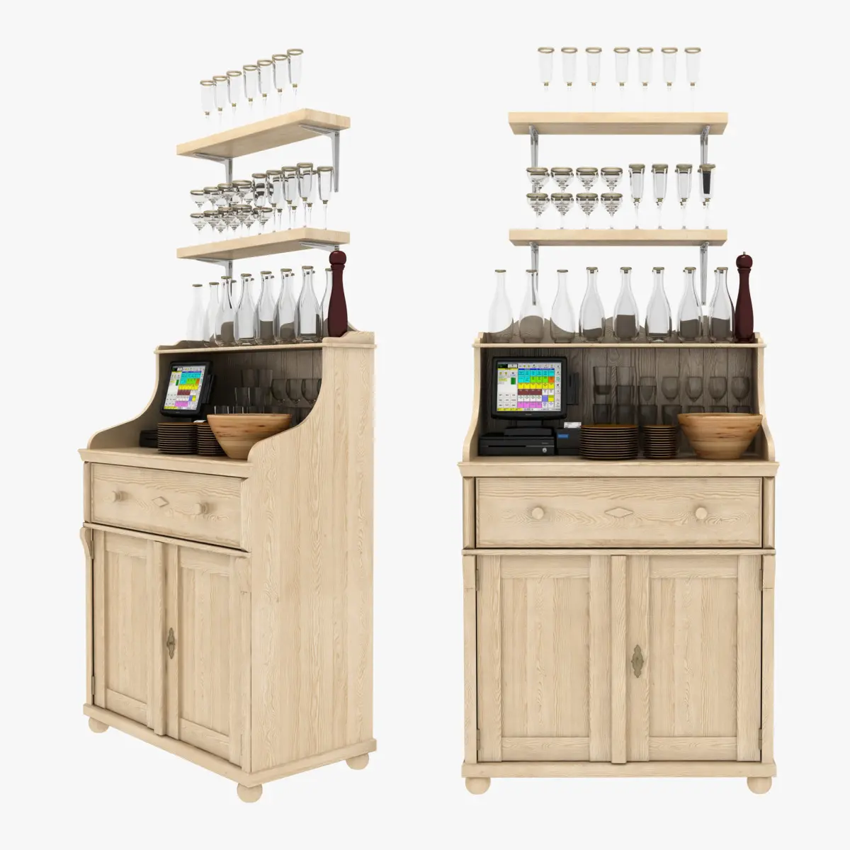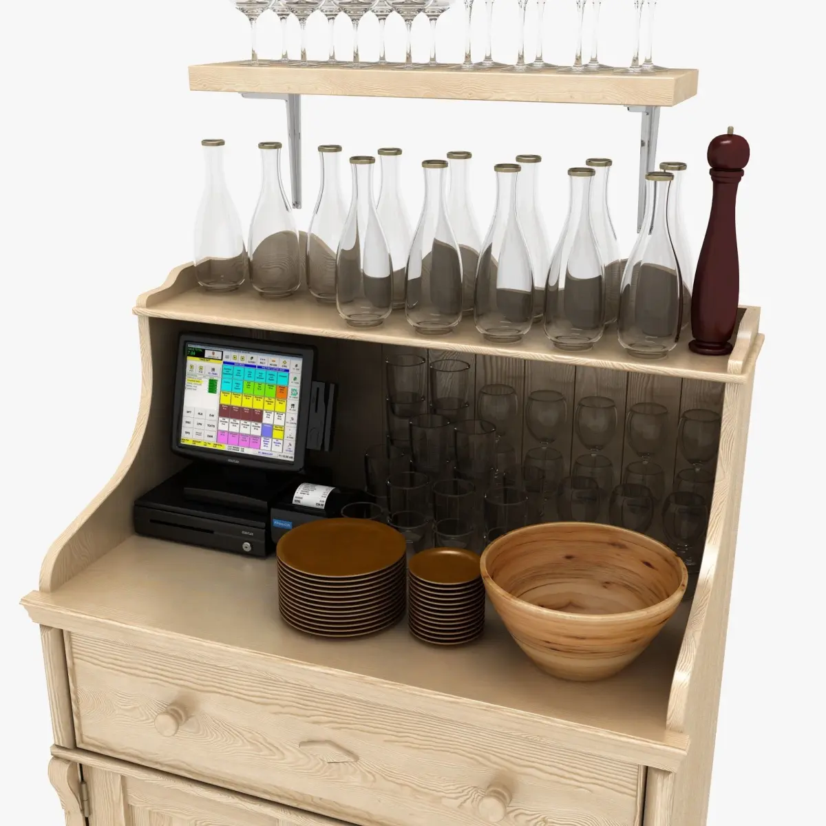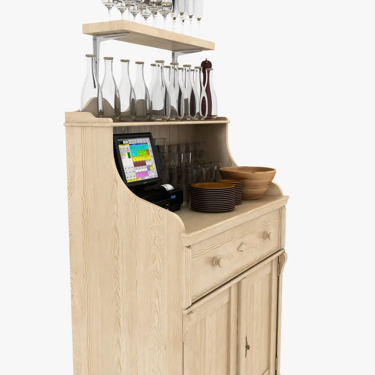 solid wood cabinet with shelves abovetwo doors and 1 drawerpos terminal computer with pay (check) devicea lot of different glasesglass bottlesclay plateswood bowlwood paperboxbeige wood finish