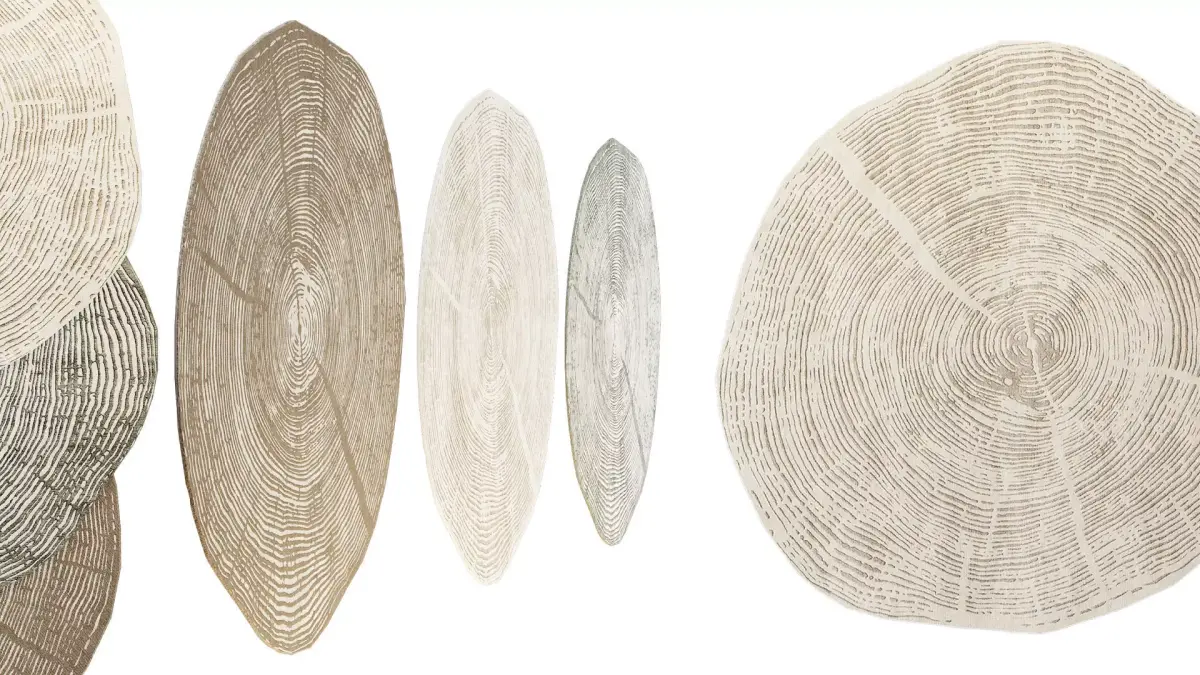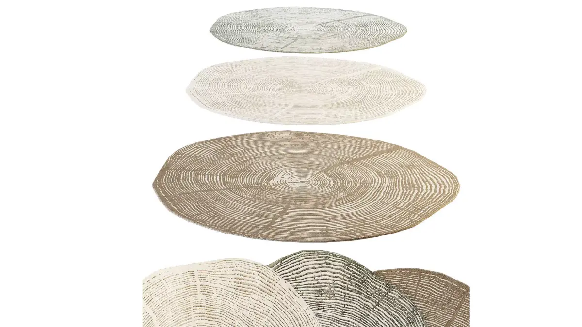 A collection of three realistic 3D models of round rugs with an organic design that mimics a cross-section of wood. The texture recreates the natural pattern of tree rings and bark with highly detailed pile. The set includes a variety of color options: classic beige, muted green (olive), and coffee-brown. These rugs are ideal for modern interiors in eco-minimalist, Scandinavian, or Japandi styles.