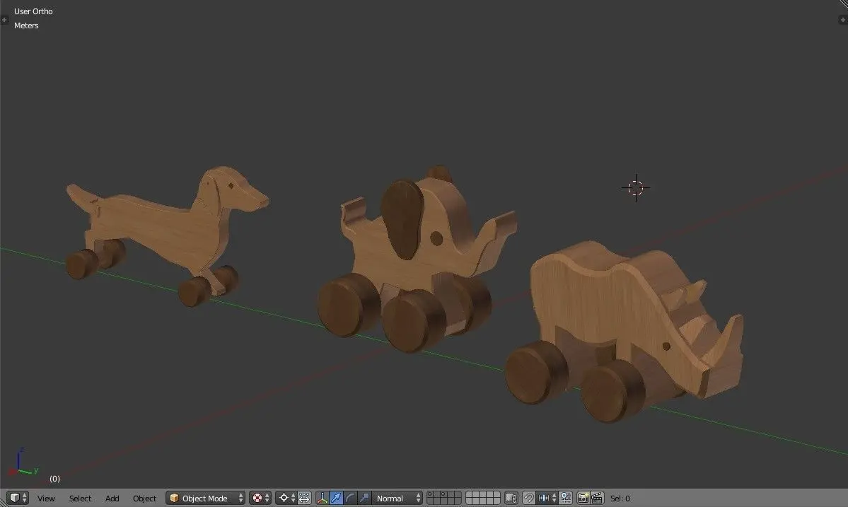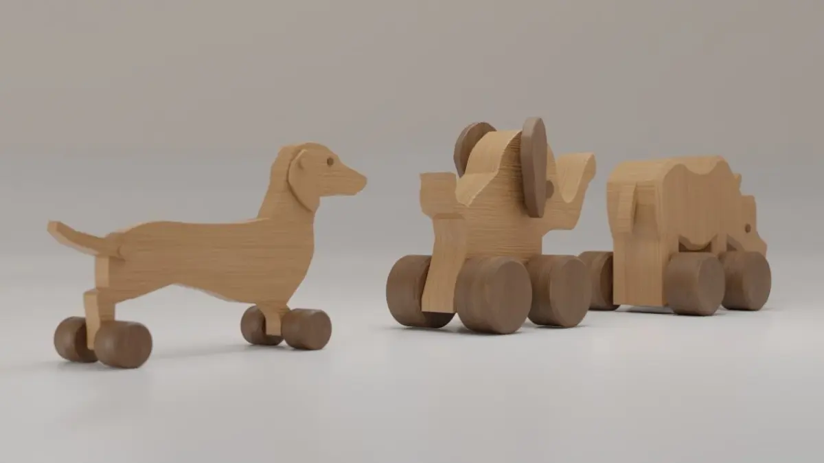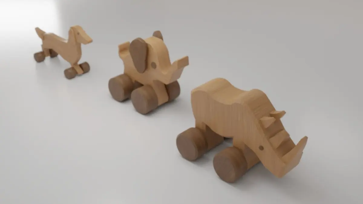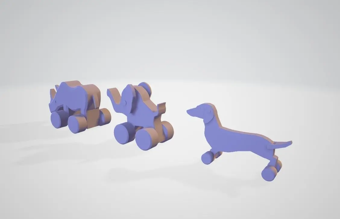 3 Wheeled Wooden toys: Dog (Dachshund), Elephant and Rhinoceros.Good model for videogames, cartoons, archiviz or design visualization.I made two textures: one, lighter, for body and one, darker, for eyes and wheels.The two diffuse tetxures share the same normal map, specular map and displacement map.Please note that some parts overlap (not ready for 3D print)