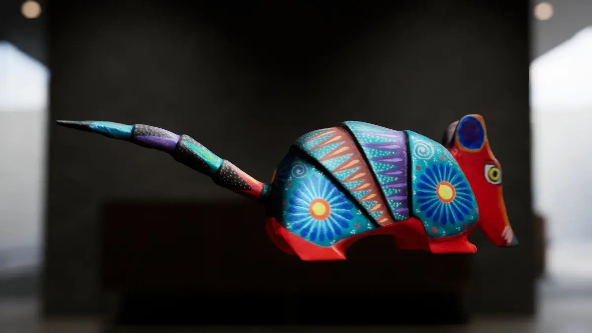 This 3D model stars a handpainted wooden armadillo, a small house ornament featuring metallic paint. The model comes in two levels of detail with 623,000 and 16,000 vertices, making it versatile for various rendering needs.