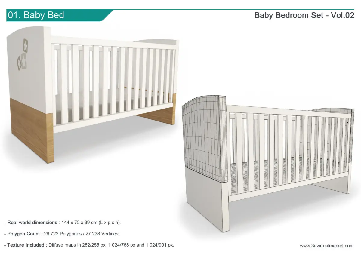 1/. Baby Bed : L.144 x H.89 x P.75 cms. 26 722 polygons / 27 238 vertices.