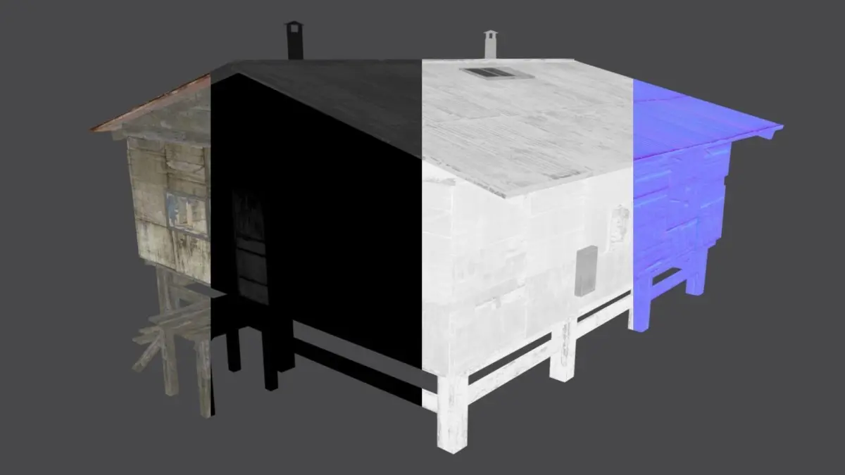 4 separate materials/texture sets: walls, roof, wood, details