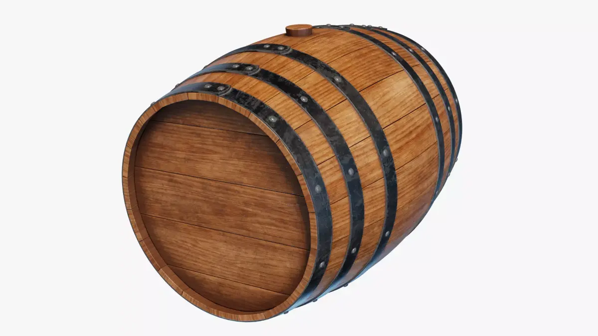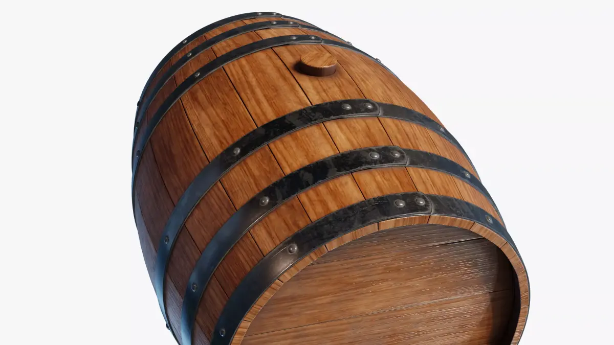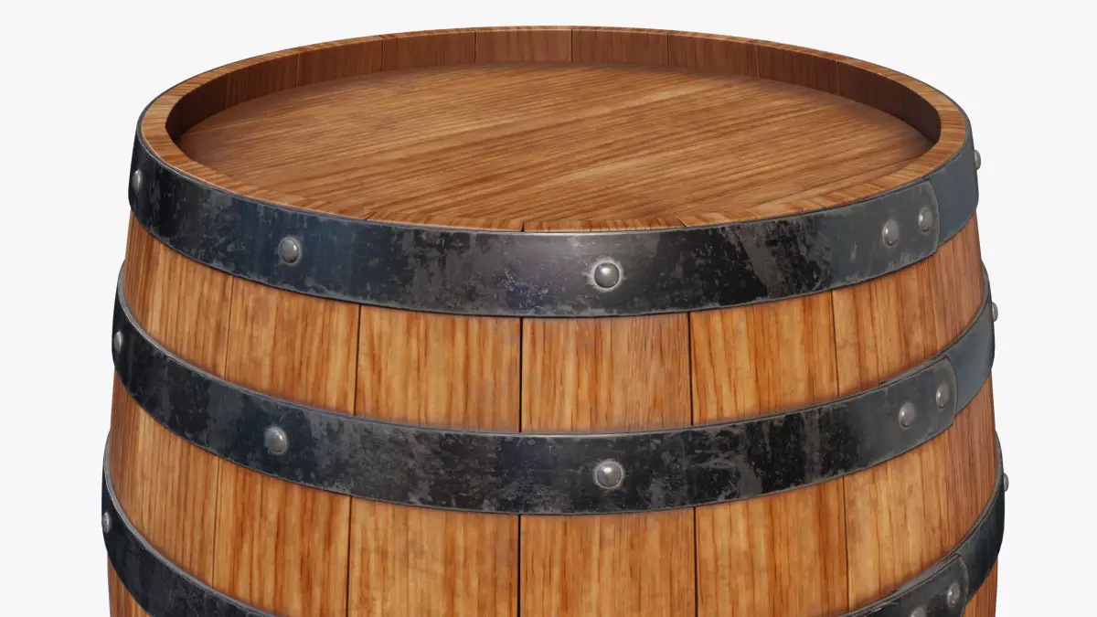High-quality, photorealistic 3D model of a wooden barrel, faithfully reproducing every real component and detail.
