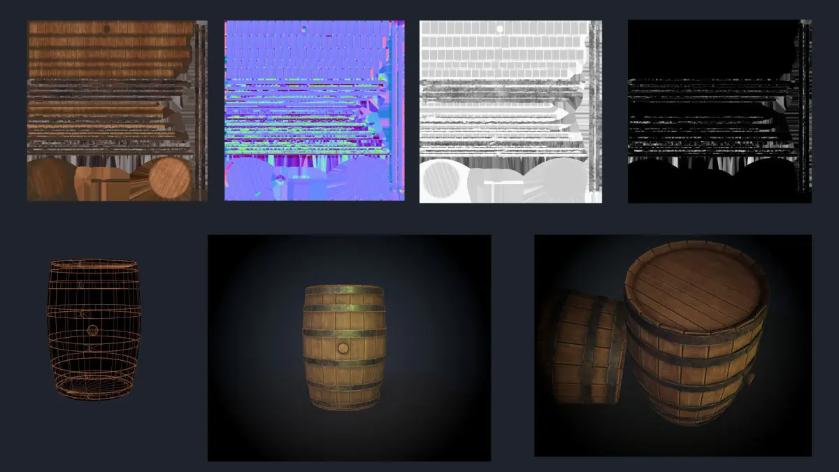 wooden old barrel with unique texture of wood made for UE low poly OBJ :1 uvi set maps 4096 :Normal/heightBasecolorORMAll the maps are made separately as well