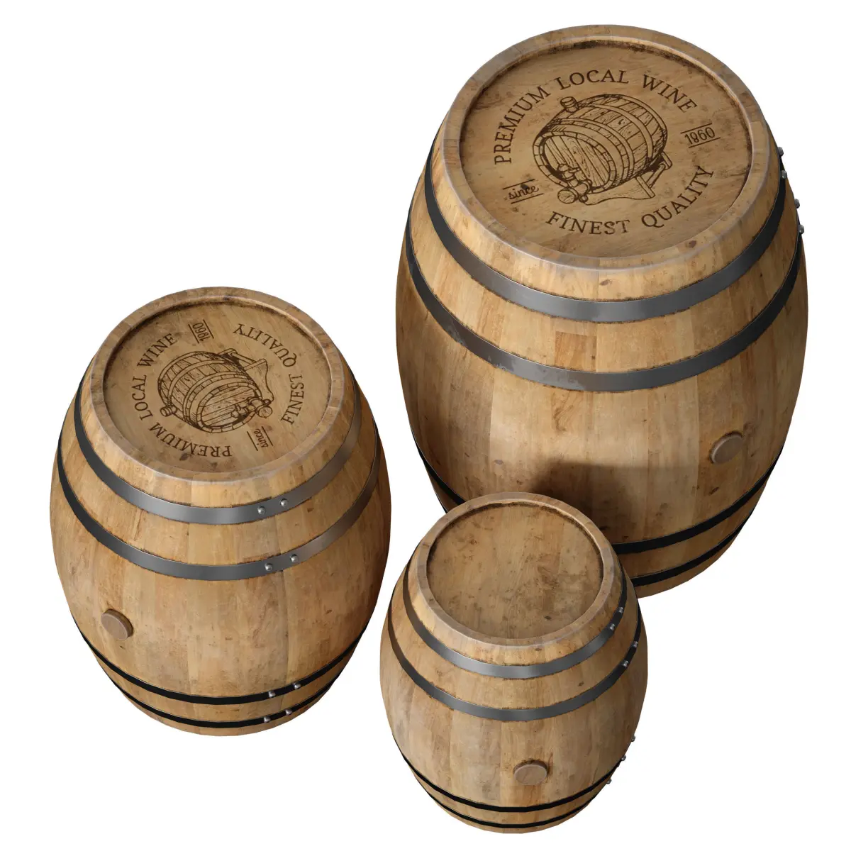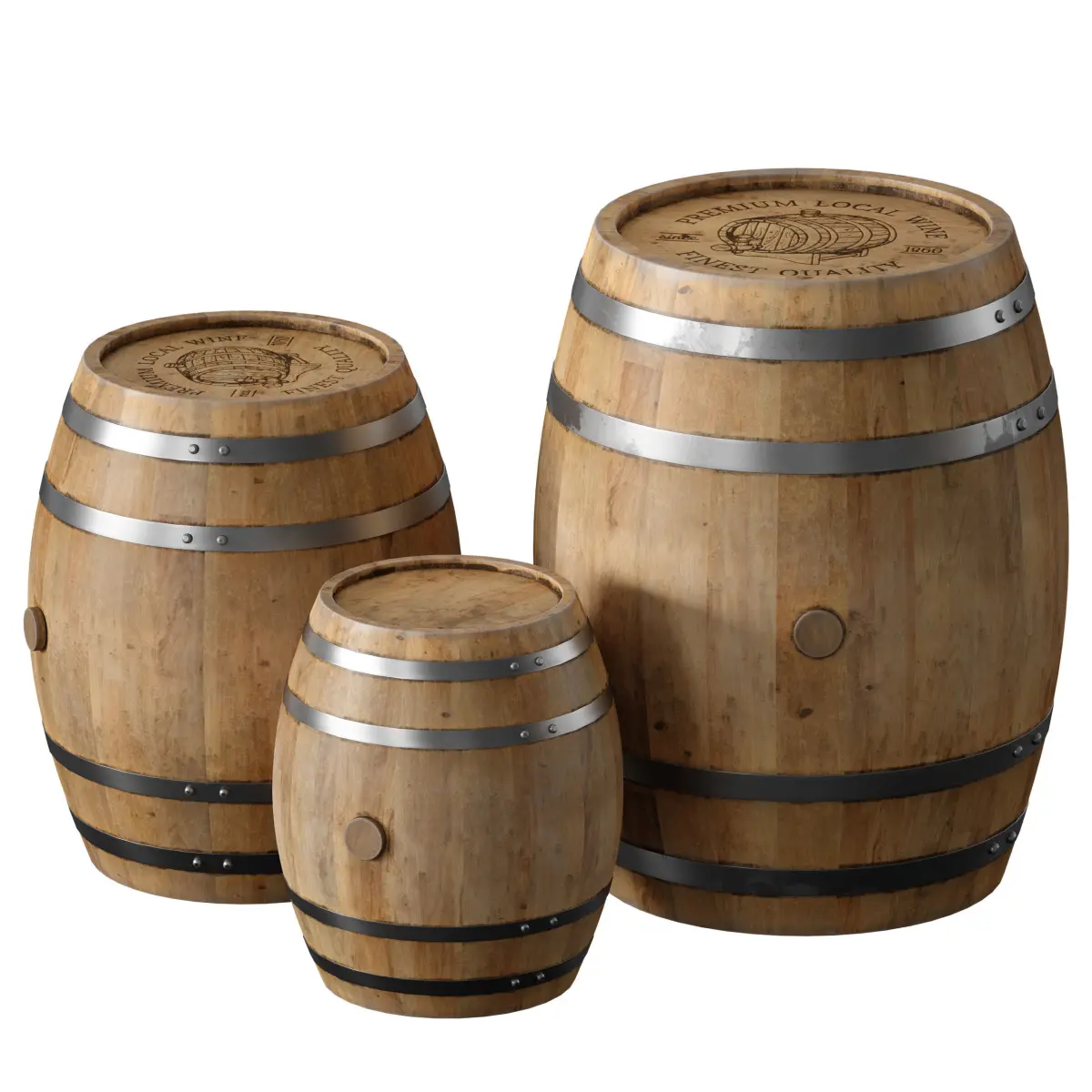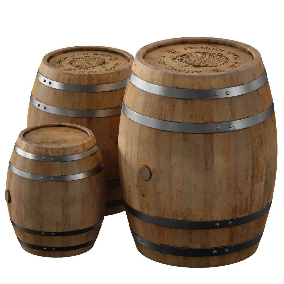 3D model of wooden barrels pulled together with steel hoops and fastened with rivets. Logos are applied to the surface of the barrels. The barrels are made of light wood. The model includes three barrels of different sizes: large, medium and small.