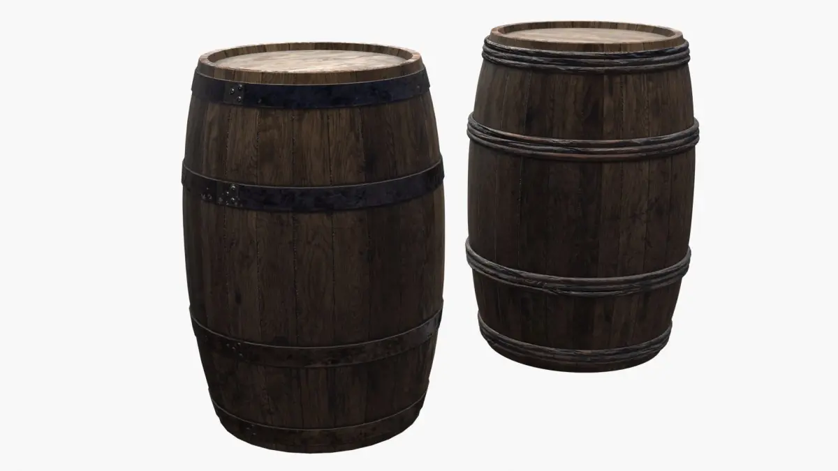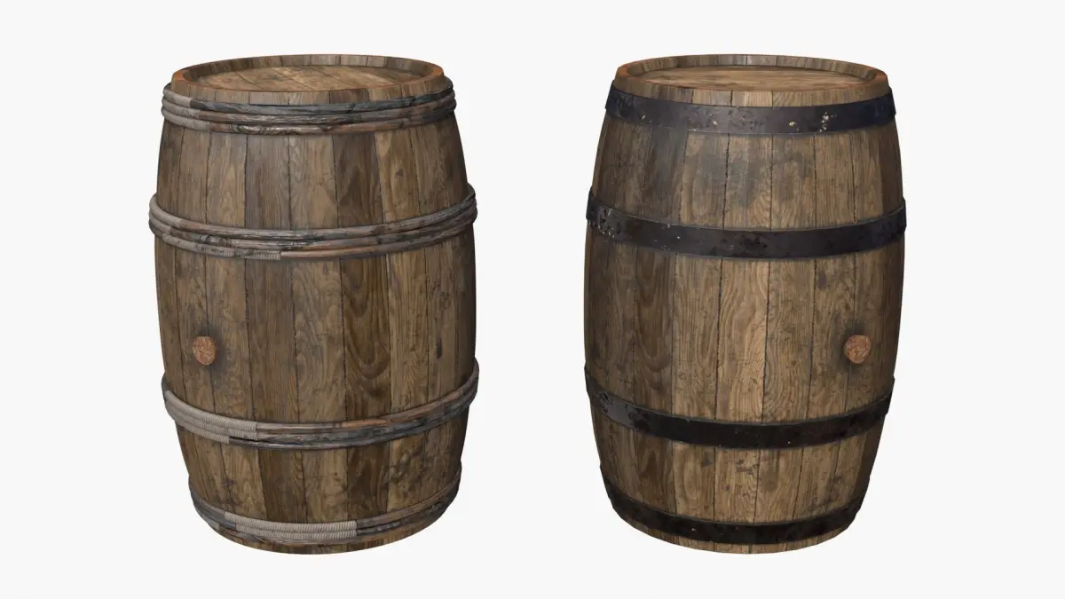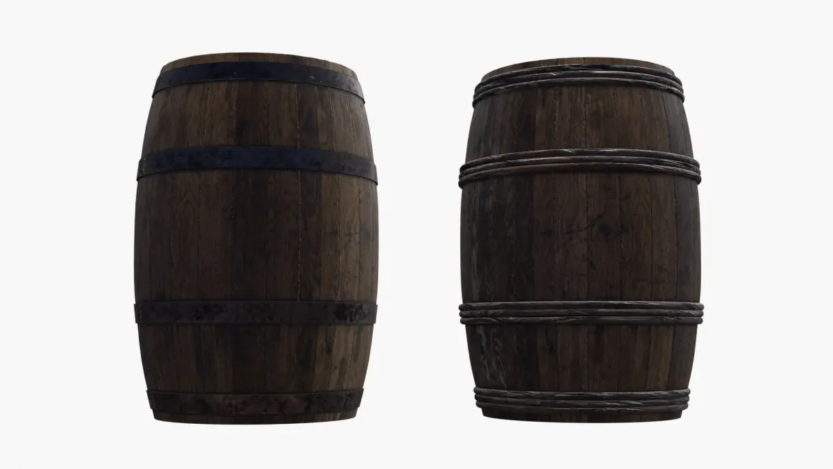 A model of old wooden barrels. The model is ready for game and include 3 LODs and a single material for each variant. It is available with 2 physical variations (barrel with metal strapping and barrel with ropes strapping). Then you can use the barrel object in any material variation with or without ropes. Ropes objects have the same material as the barrels.