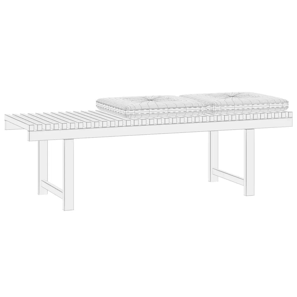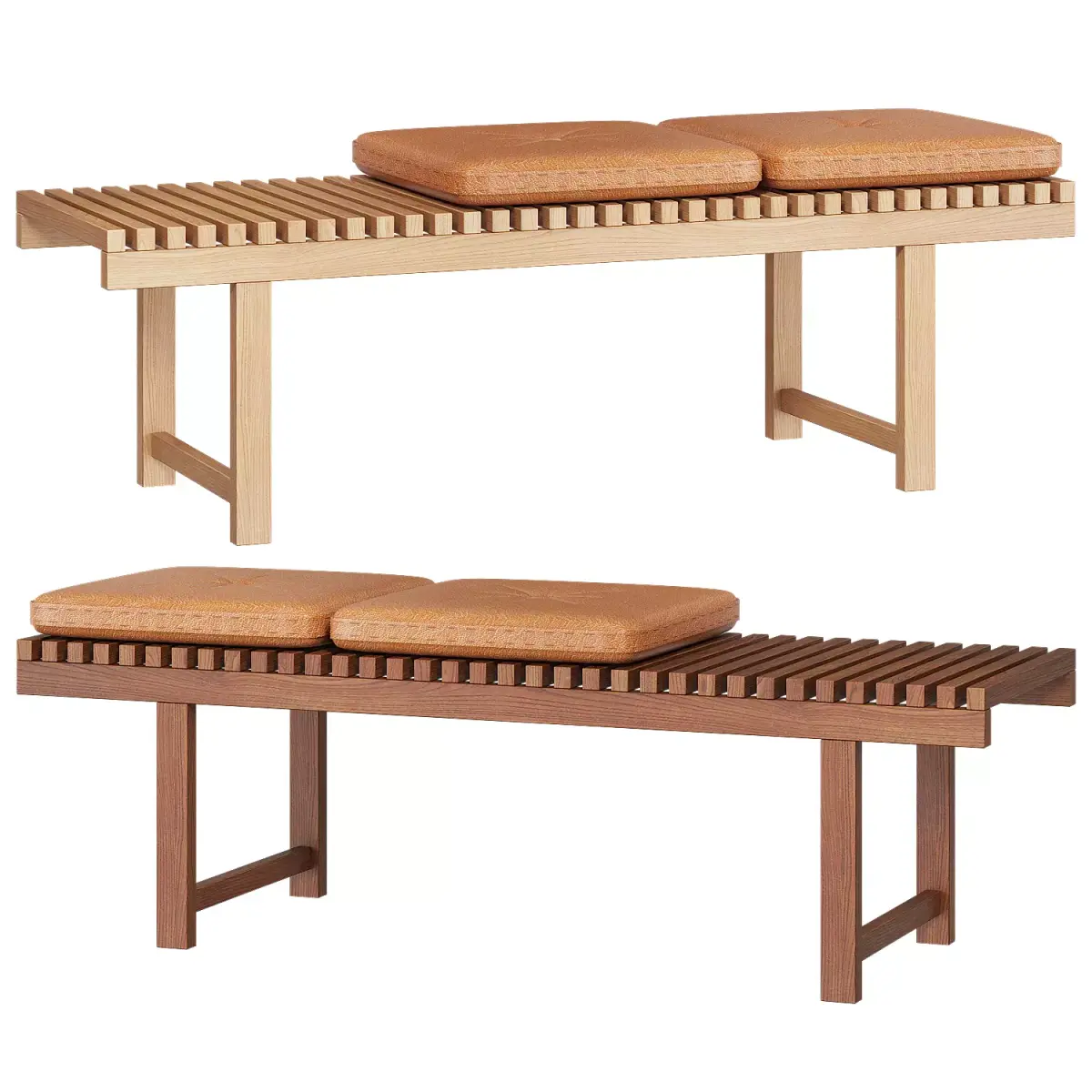 There are two benches in the archive: light and dark wood, both with 2 brown leather cushions.