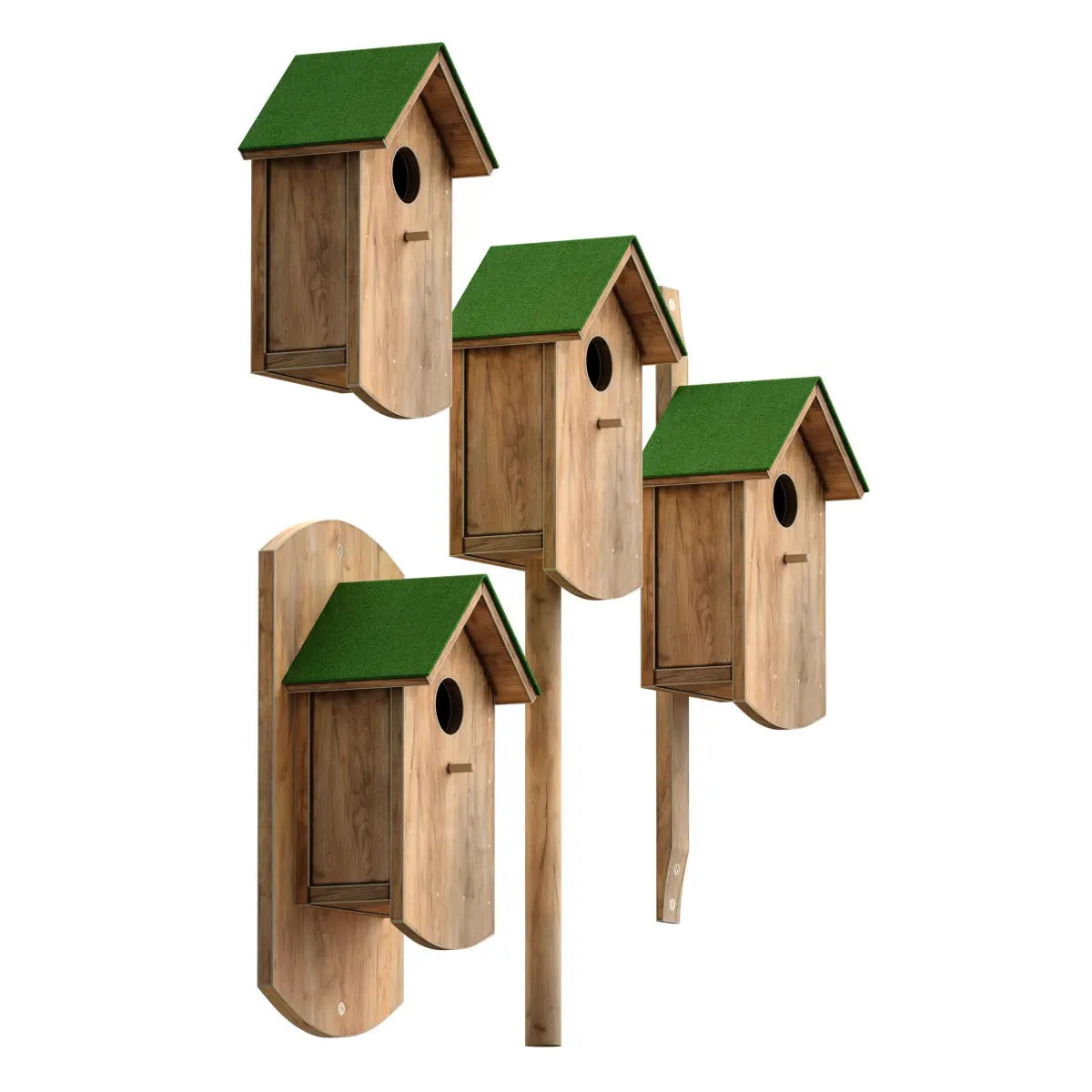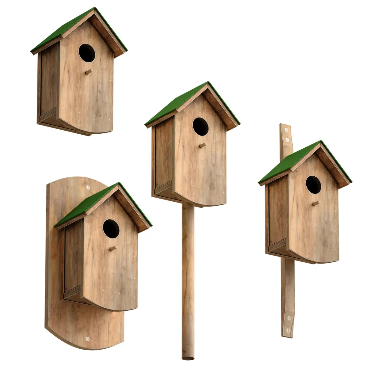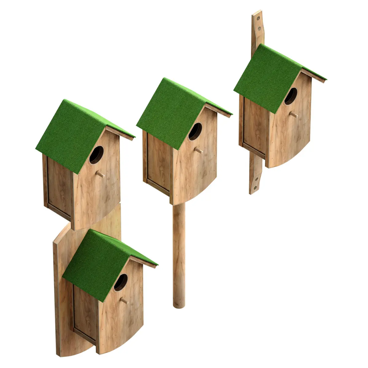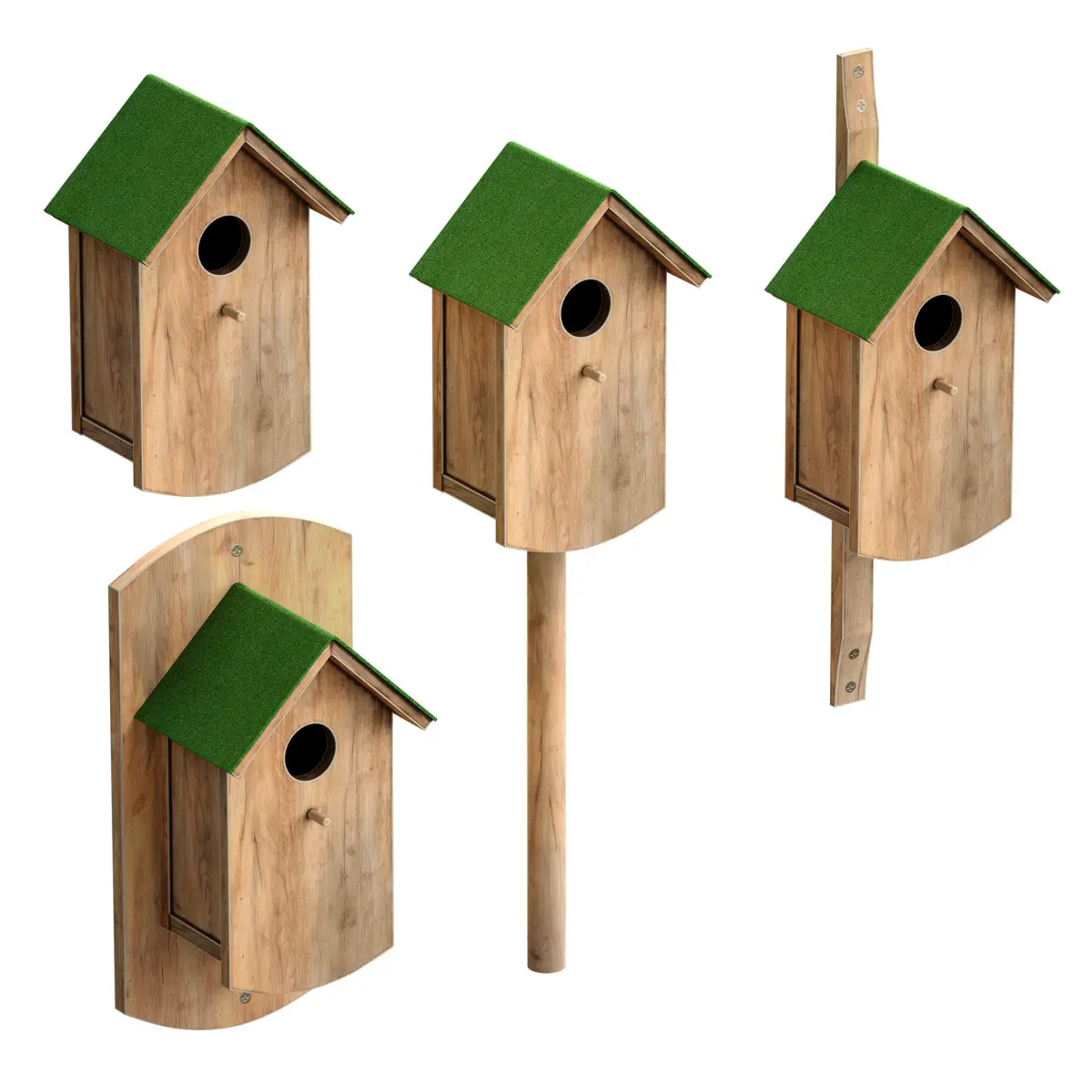 3d model of a wooden birdhouse for birds. Made of light wood with a green coating on the roof. The model is made for anti-aliasing. There are several options for attaching a birdhouse to the base.