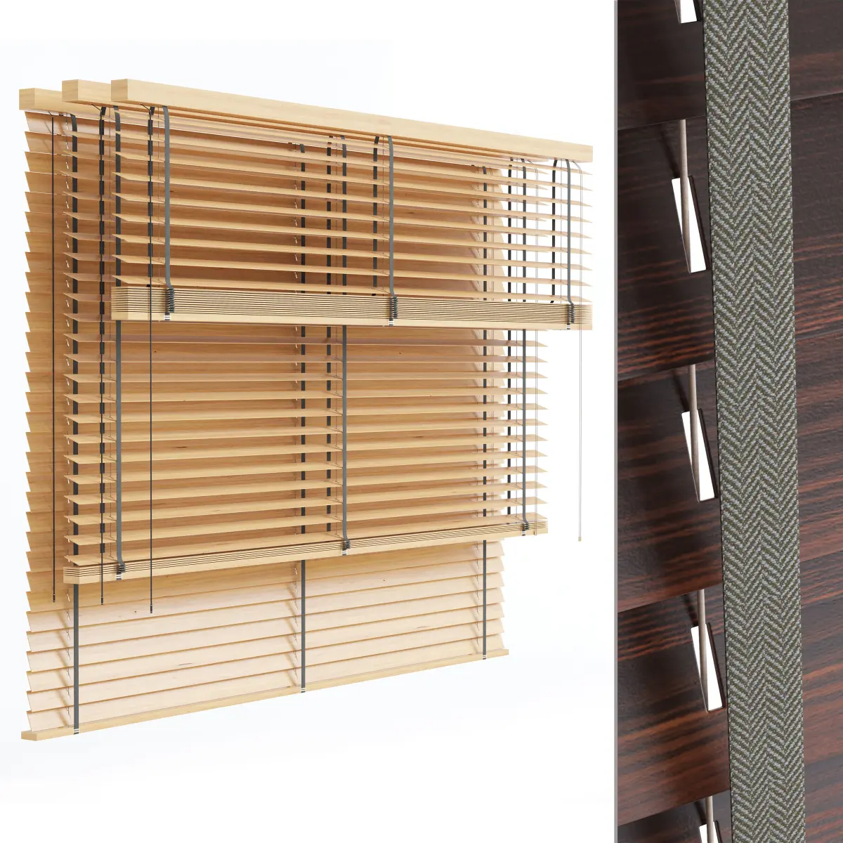 Wooden blinds Set 02The archive contains:Max 2015 Vray - Corona obj FbxQuads only All objects and materials are logically named. 2 Size (150cm * 100cm , 150cm, 200cm) 3 Materials 3 positions (18 Different Blinds)
