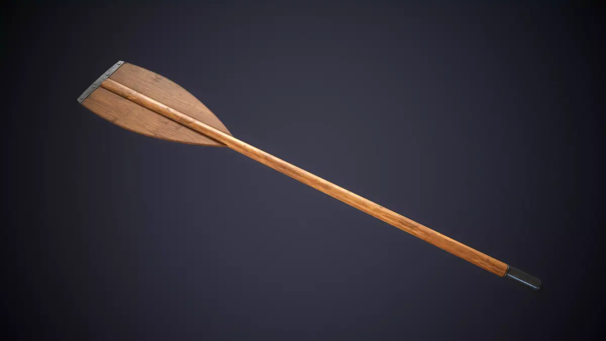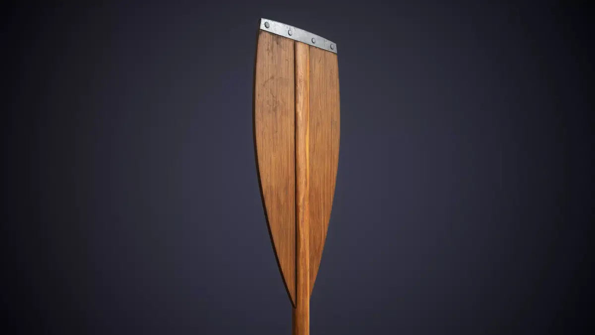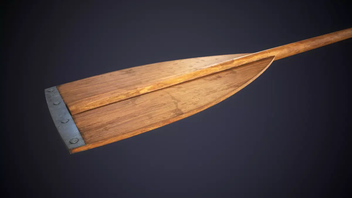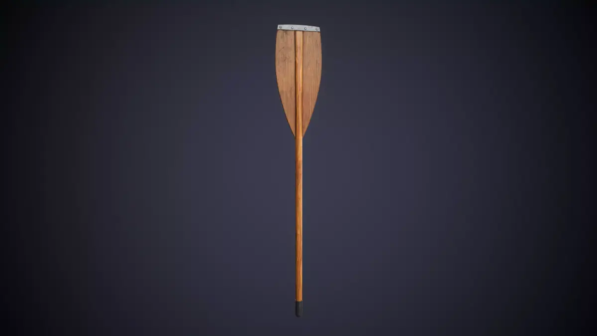 This model features a classic wooden oar with a reinforced blade and a metal tip secured by rivets.