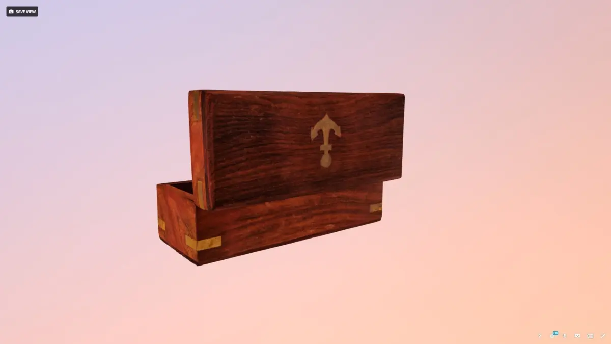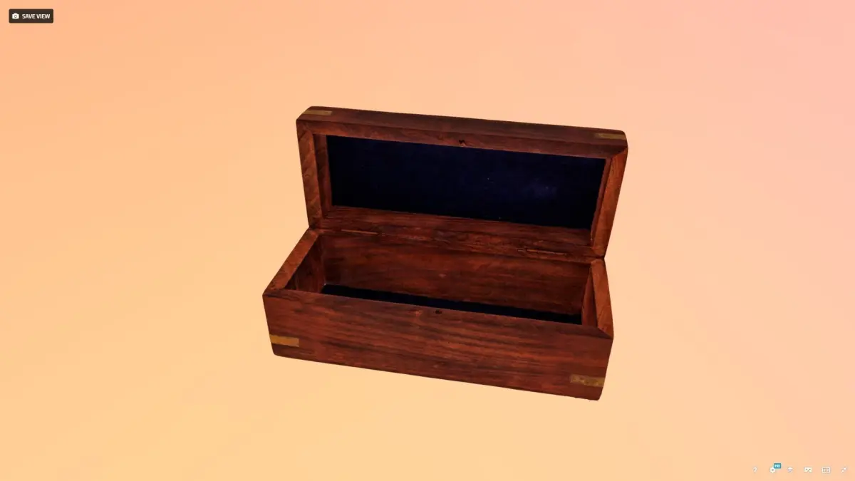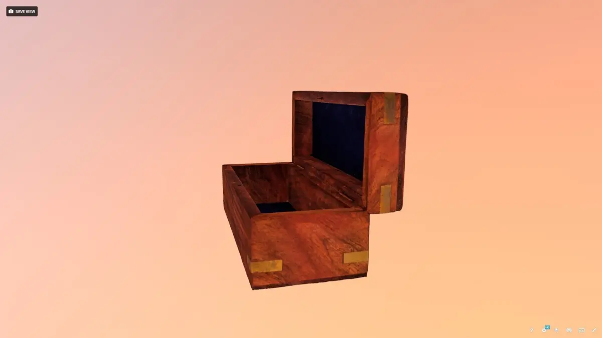 Photo-real, unlit, texturized model of an open wooden box. This object was generated using photogrammetry with a DSLR camera and images edited in Light Room, compiled in Reality Capture, and re-topologized in Insta-Mesh. The mesh is edited in Agisoft, and model retextured in Reality Capture.