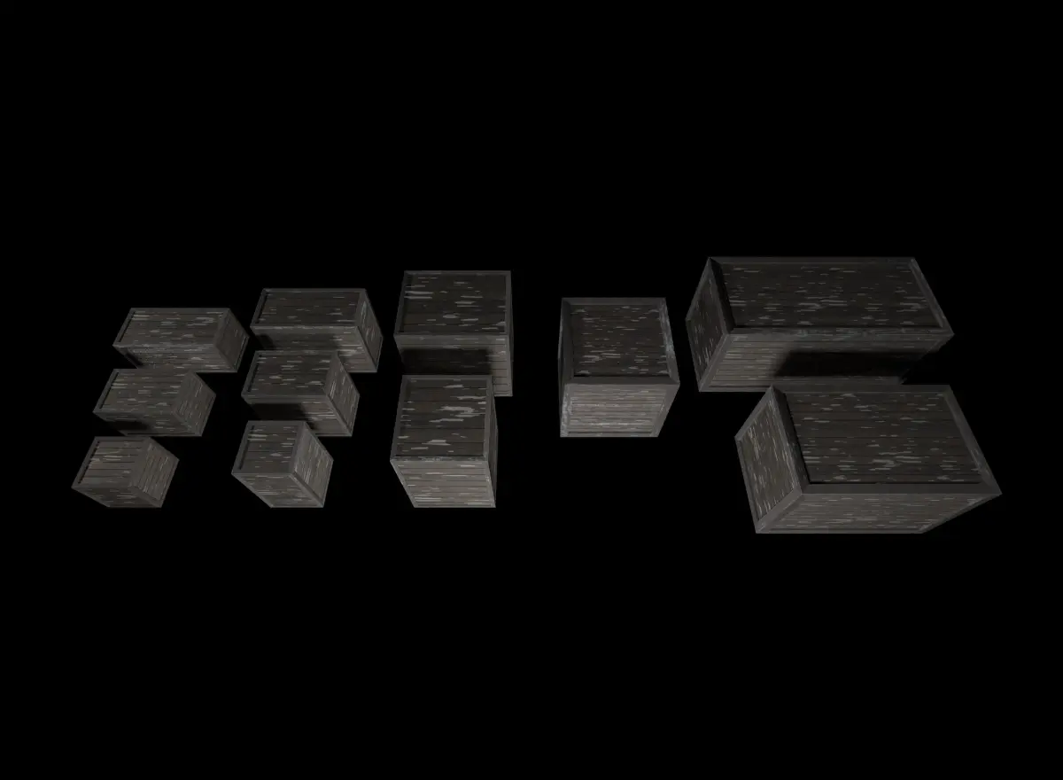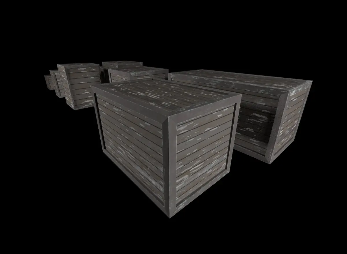 Low-poly models set of wooden boxes with high quality PBR textures (4096x4096). Rendering in V-ray.