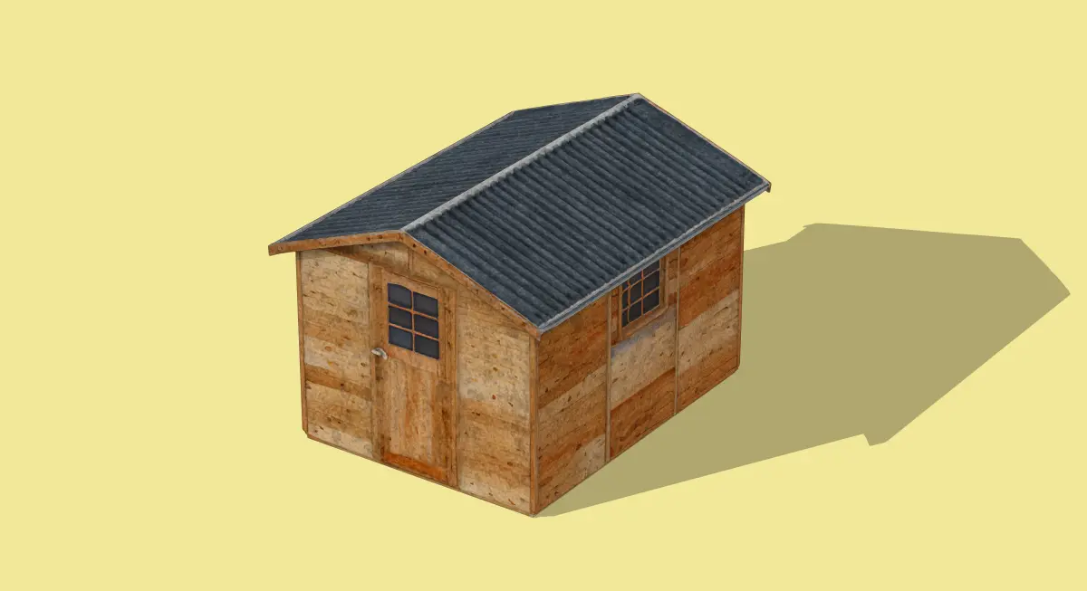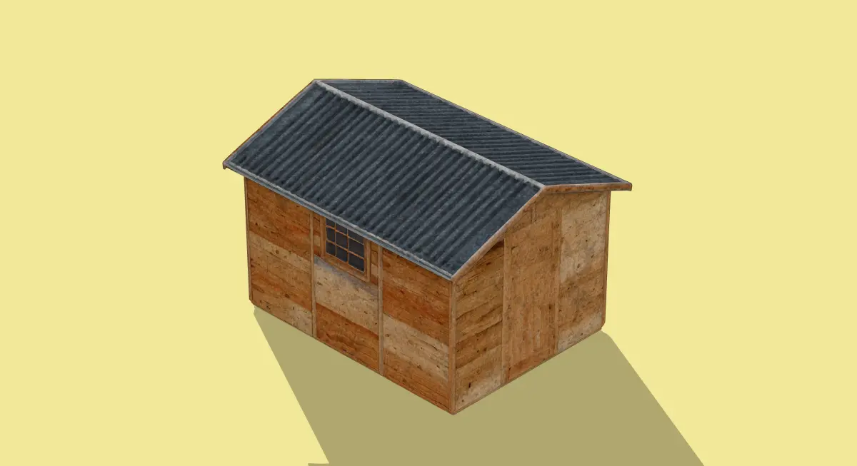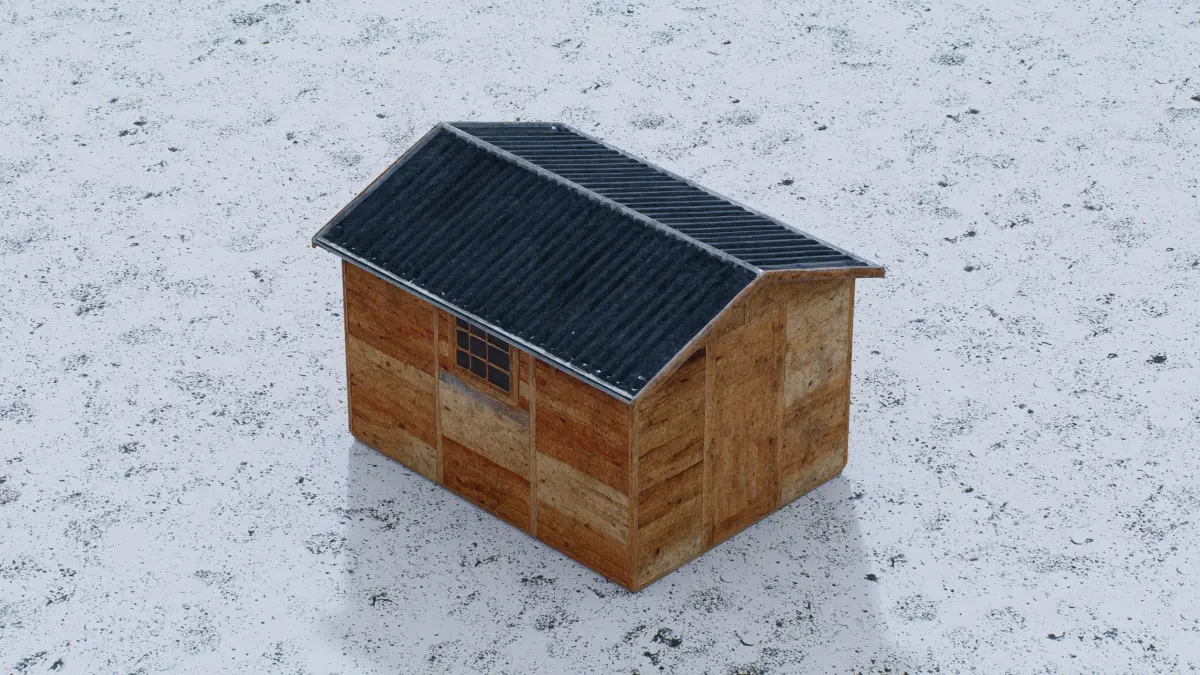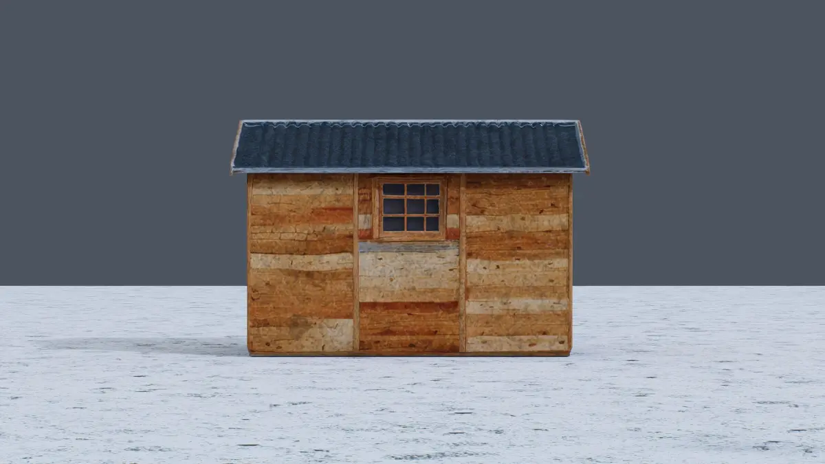This 3D low-poly model portrays a quaint wooden cabin with a rustic charm. The structure features a sloped roof covered in dark shingles, paired with weathered wooden walls that exude a natural, aged look. Small windows and a simple door enhance its cozy, minimalist design. With subtle shadows adding depth, this model is perfect for rural landscapes, survival game settings, or architectural visualizations.