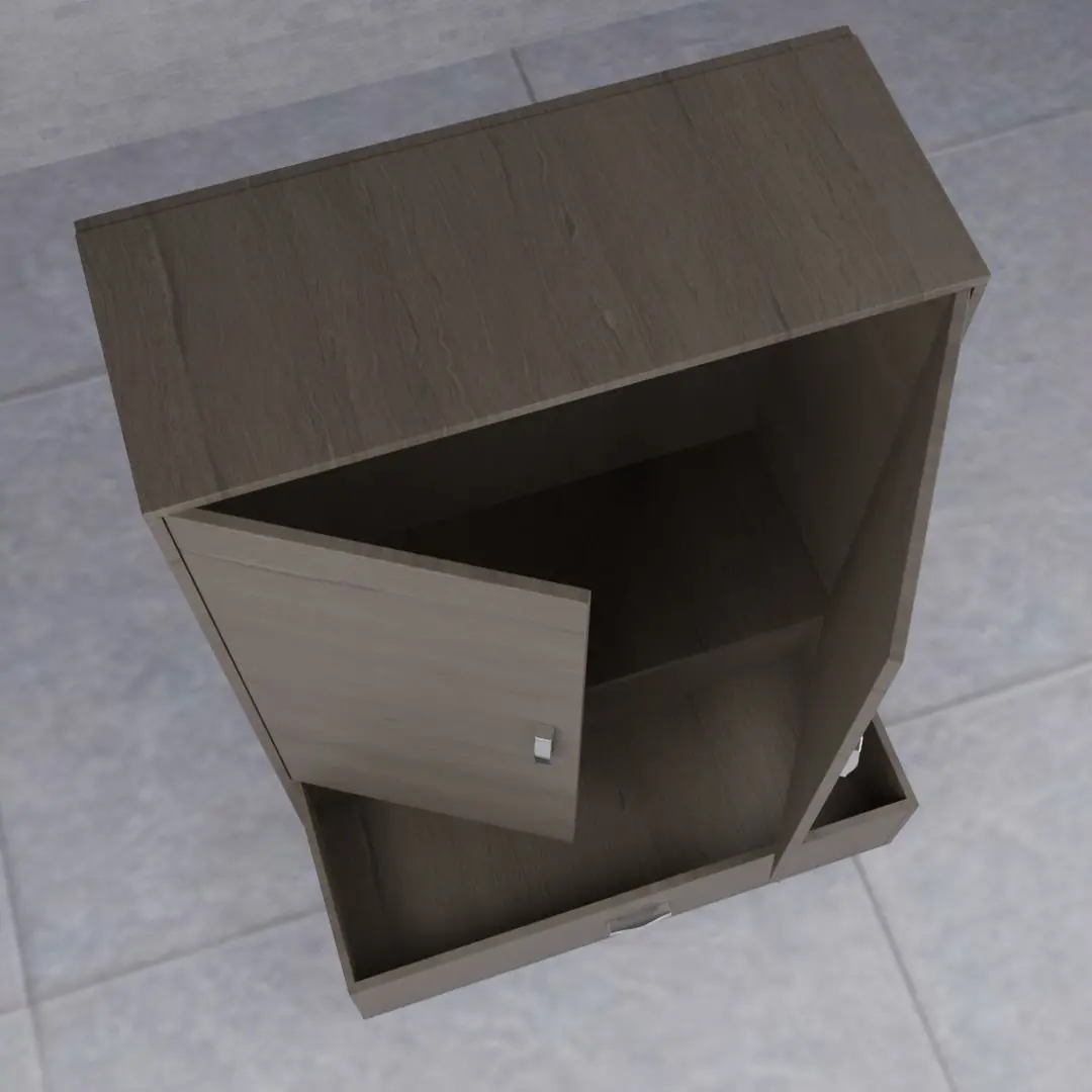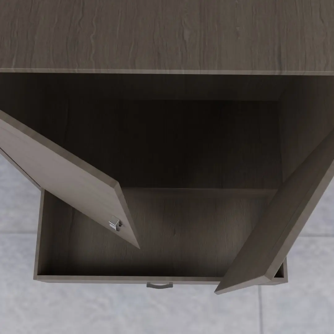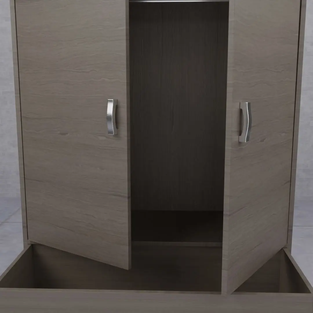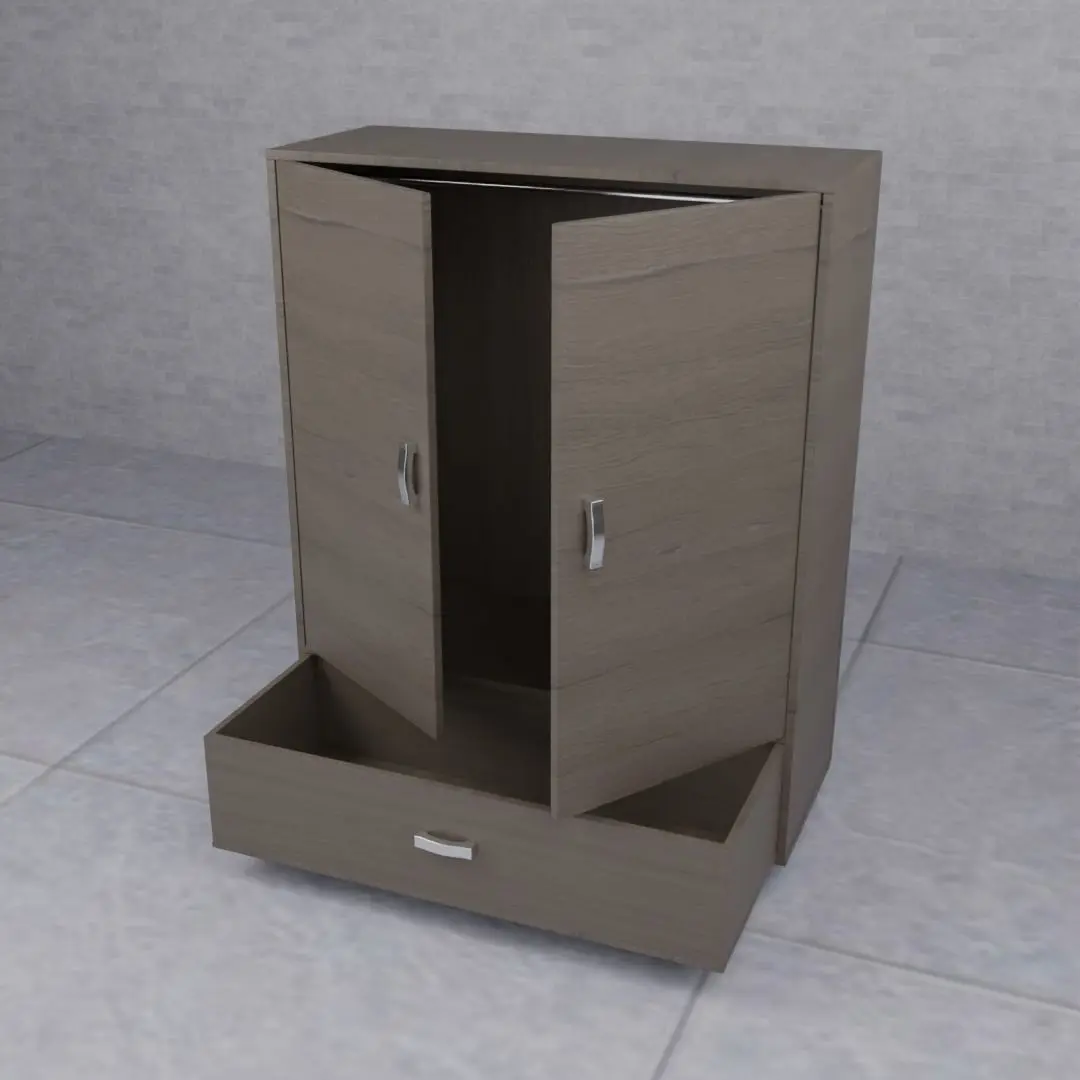 Modern wooden cabinet the object has 5 parts, Left and right doors, a drawer, a metal bar, and the cabinet body.