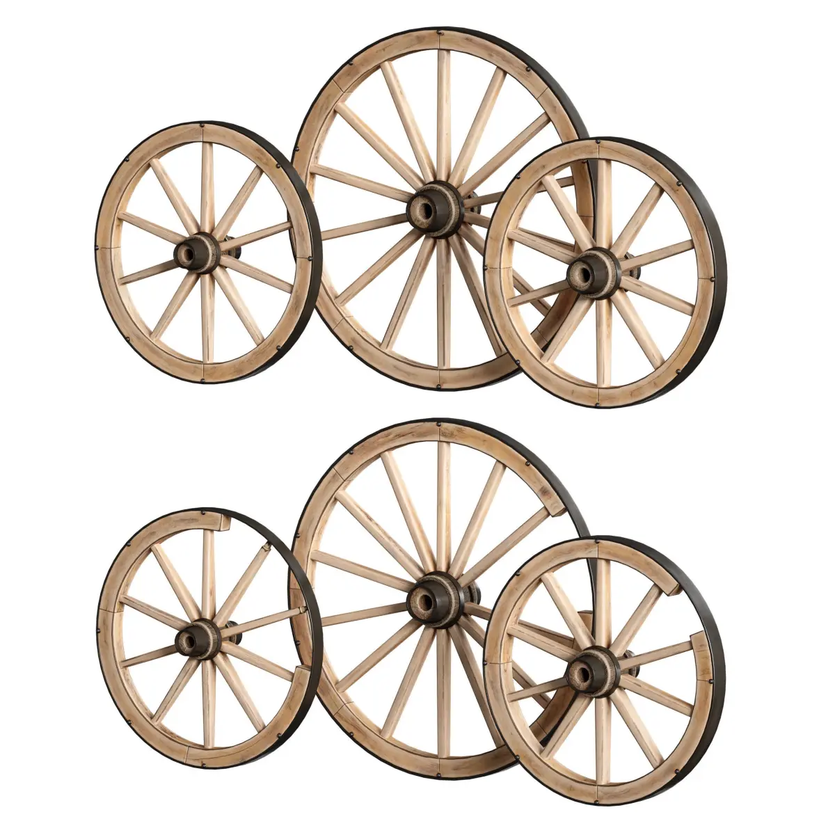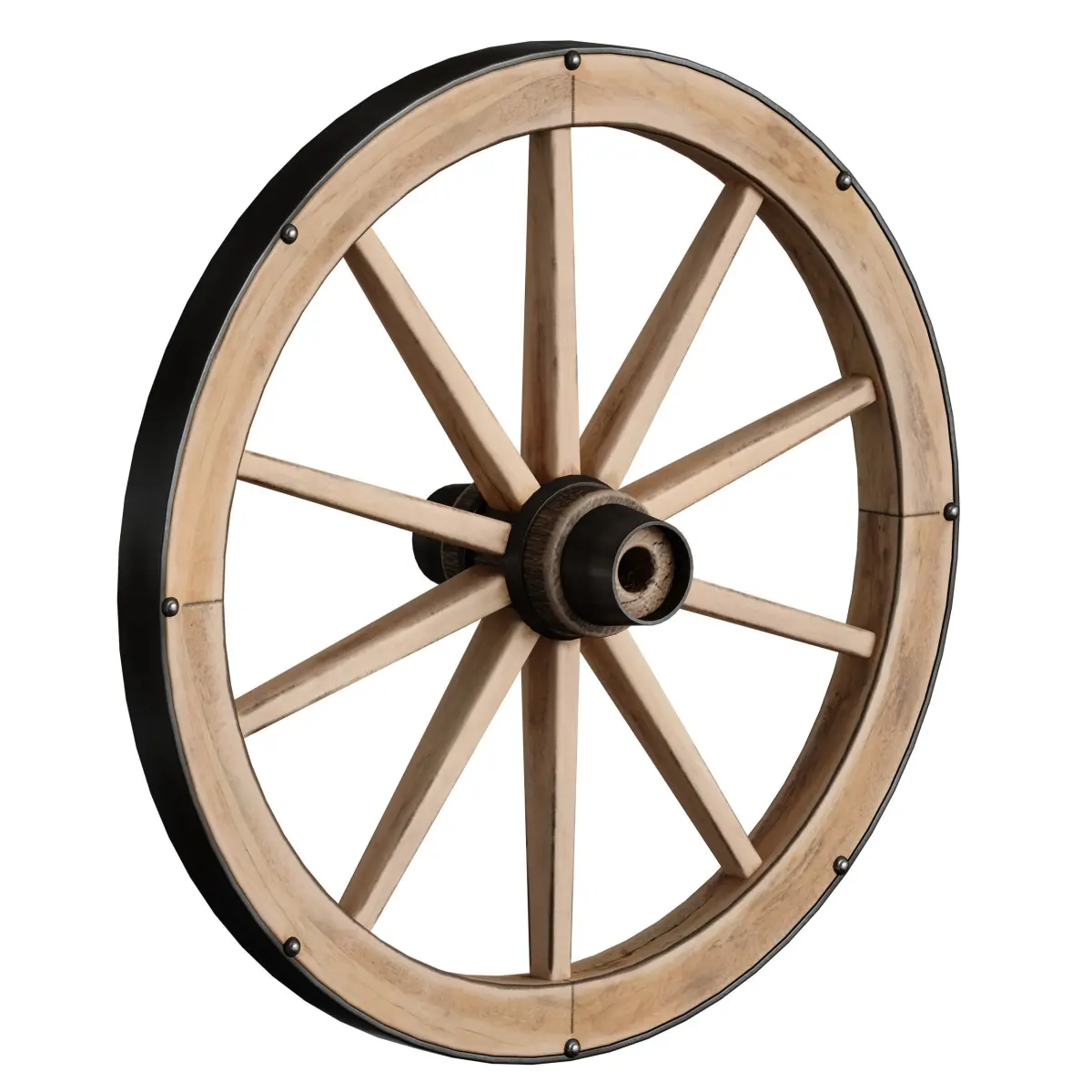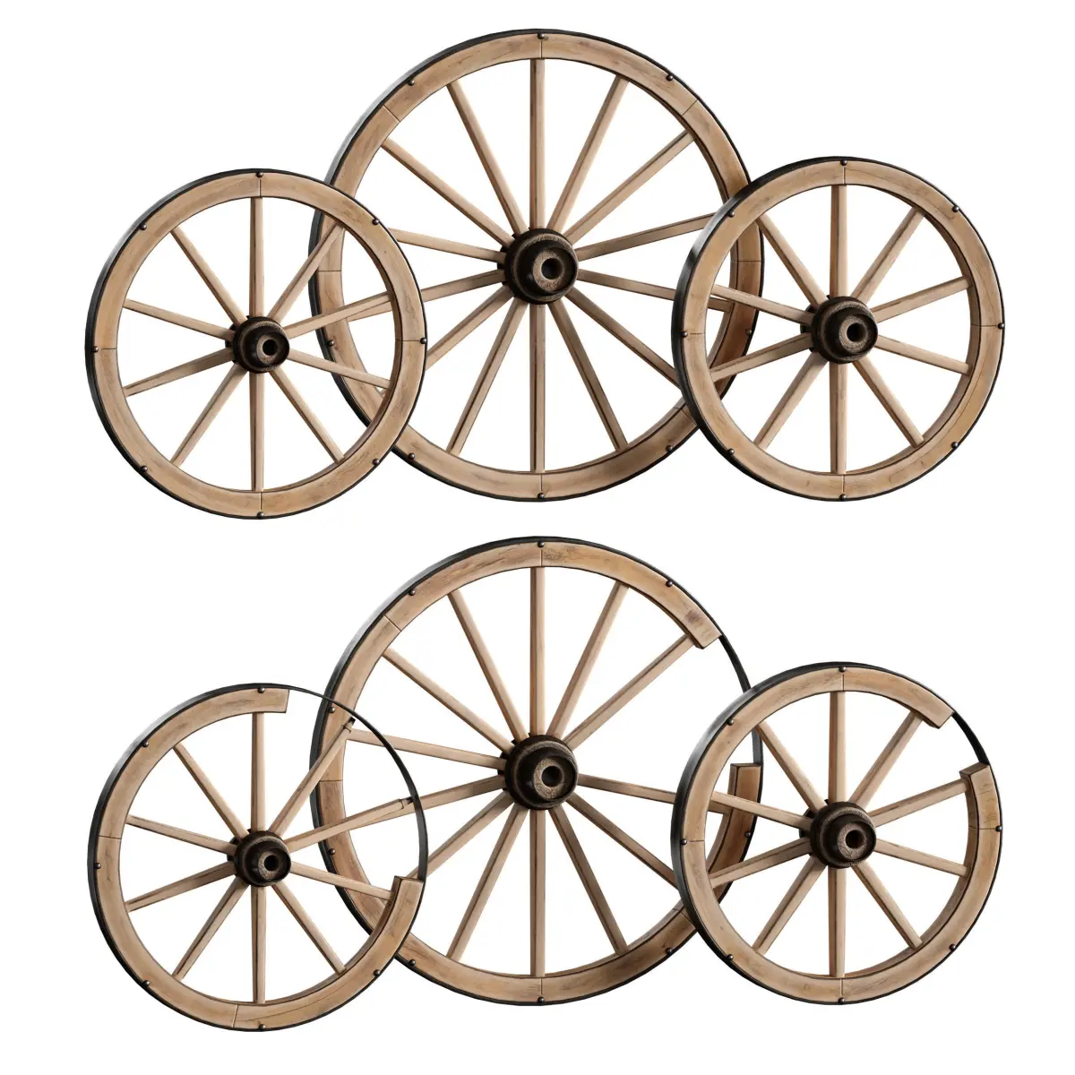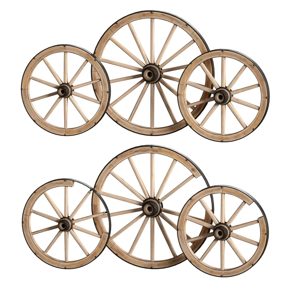 3D model of wooden wheels with wooden spokes and a metal rim for a cart of different shapes and sizes. There are also several options with partial destruction. The model can be used both for its intended purpose and as decoration.