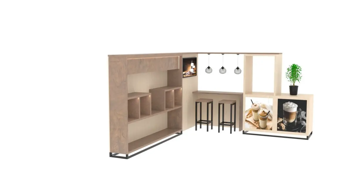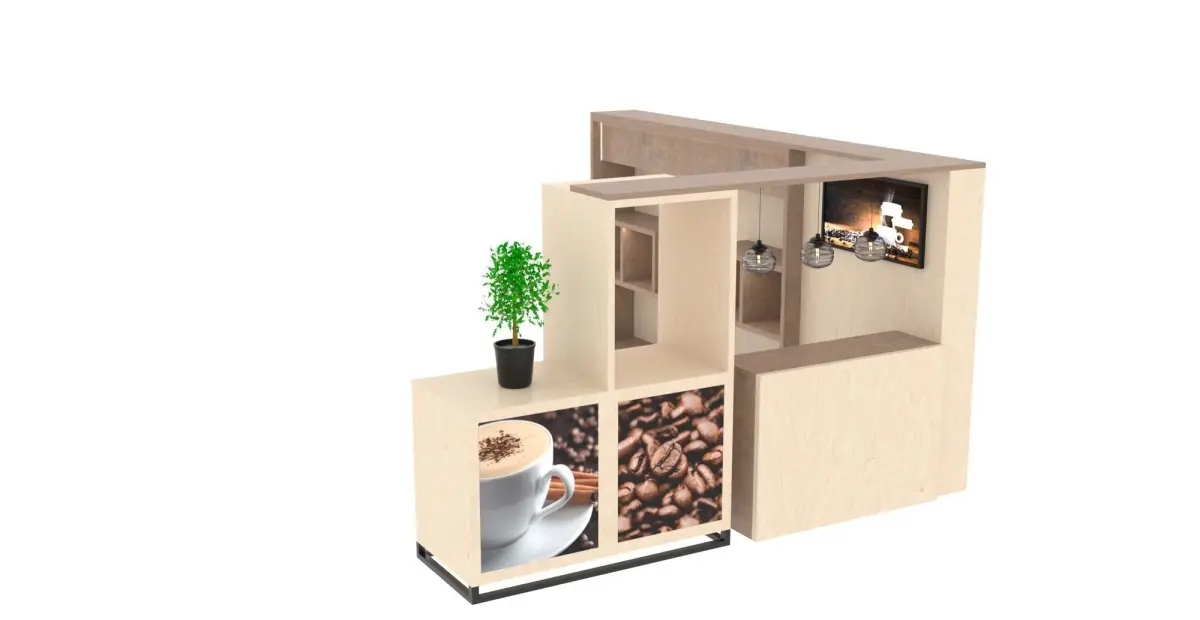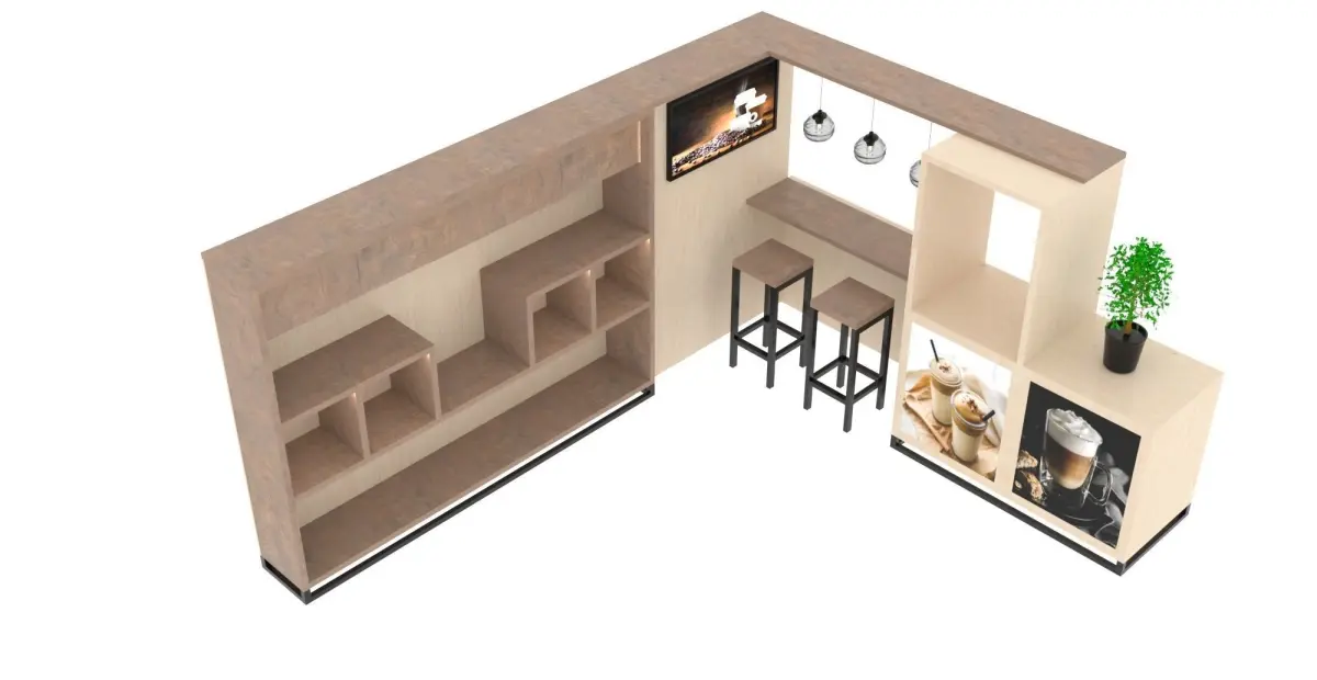 This is low-poly model of wooden coffee zone, which have stand for presentation coffee and coffee machines, bar counter and TV.