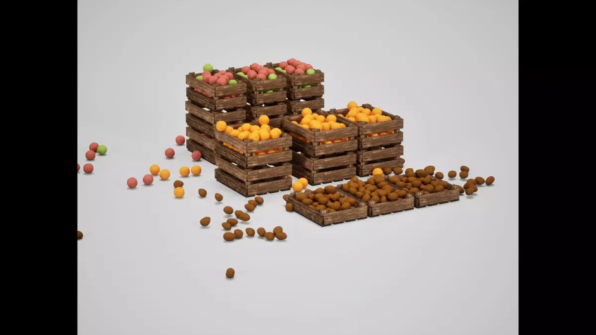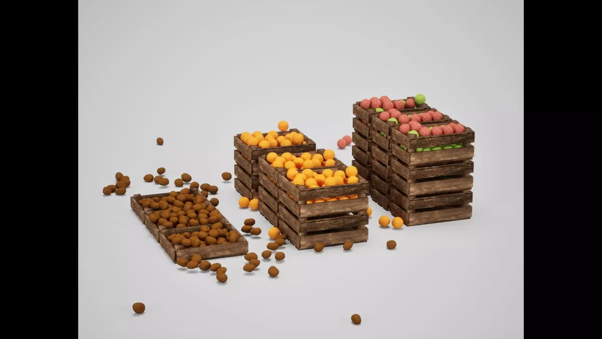 This asset features sturdy wooden crates loaded with colorful produce (apples and oranges). Designed to add vibrancy and life to market stalls, kitchen cellars, or cargo piles, these crates provide an essential narrative element for any environment involving trade or food.