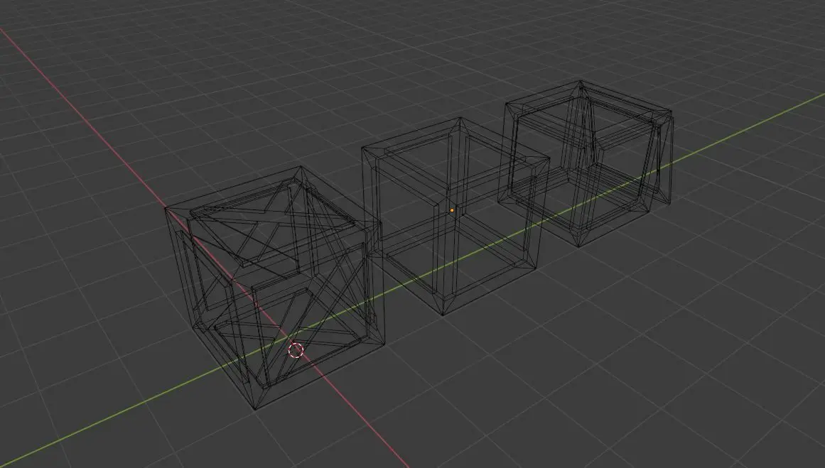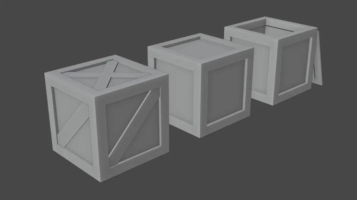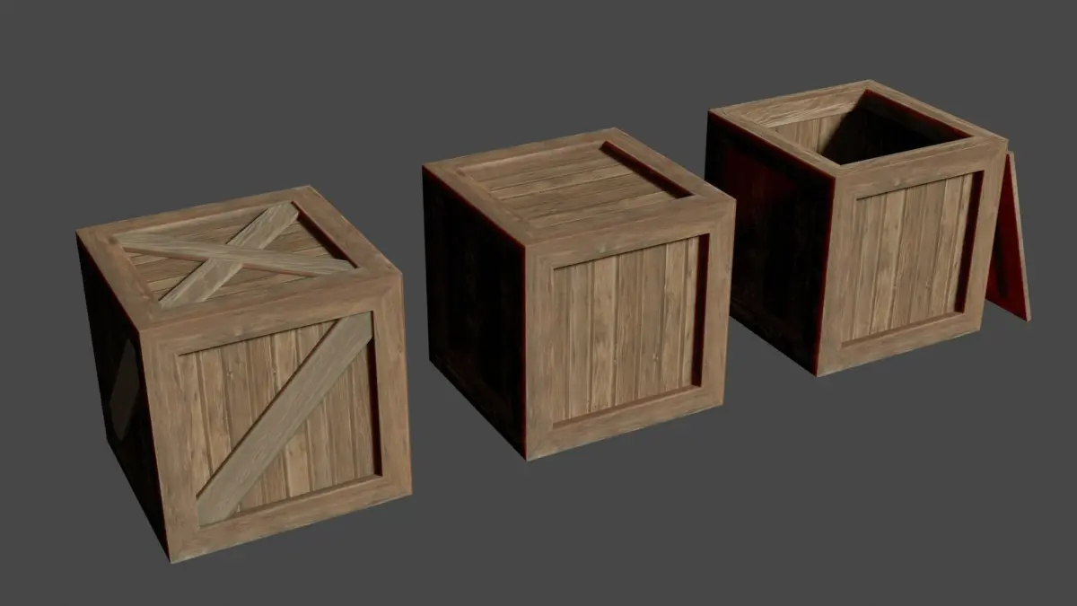 Left crate(sidePlanks): Vertices 299, Edges 426, Faces 130, Triangles 408. Middle crate(default): Vertices 56, Edges 108, Faces 54, Triangles 408. Right crate(opened): Vertices 92, Edges 176, Faces 88, Triangles 284.