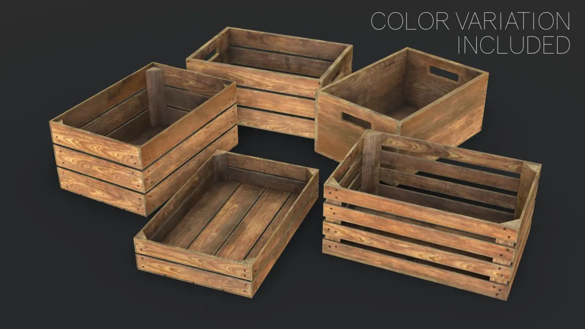 This wooden crates set includes 3 LODs. The set includes 5 individual objects and 7 prefabs (whose 2 prefabs with tarp). Those wooden crates are ready for game and available in lowpoly and PBR ready. Also, the material is unique for all crates but includes 2 Base Color variants to get 2 color variations of the planks.