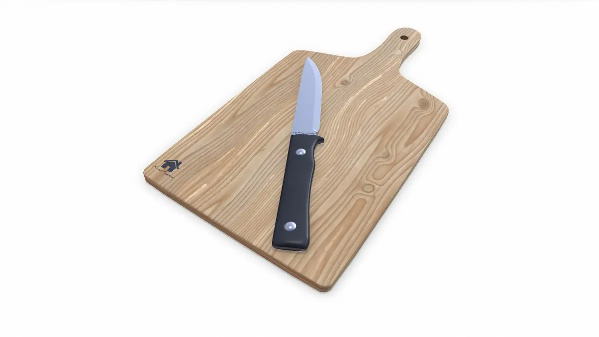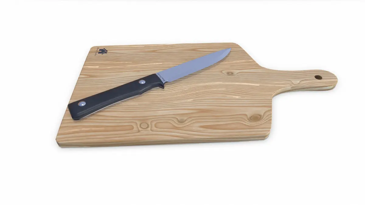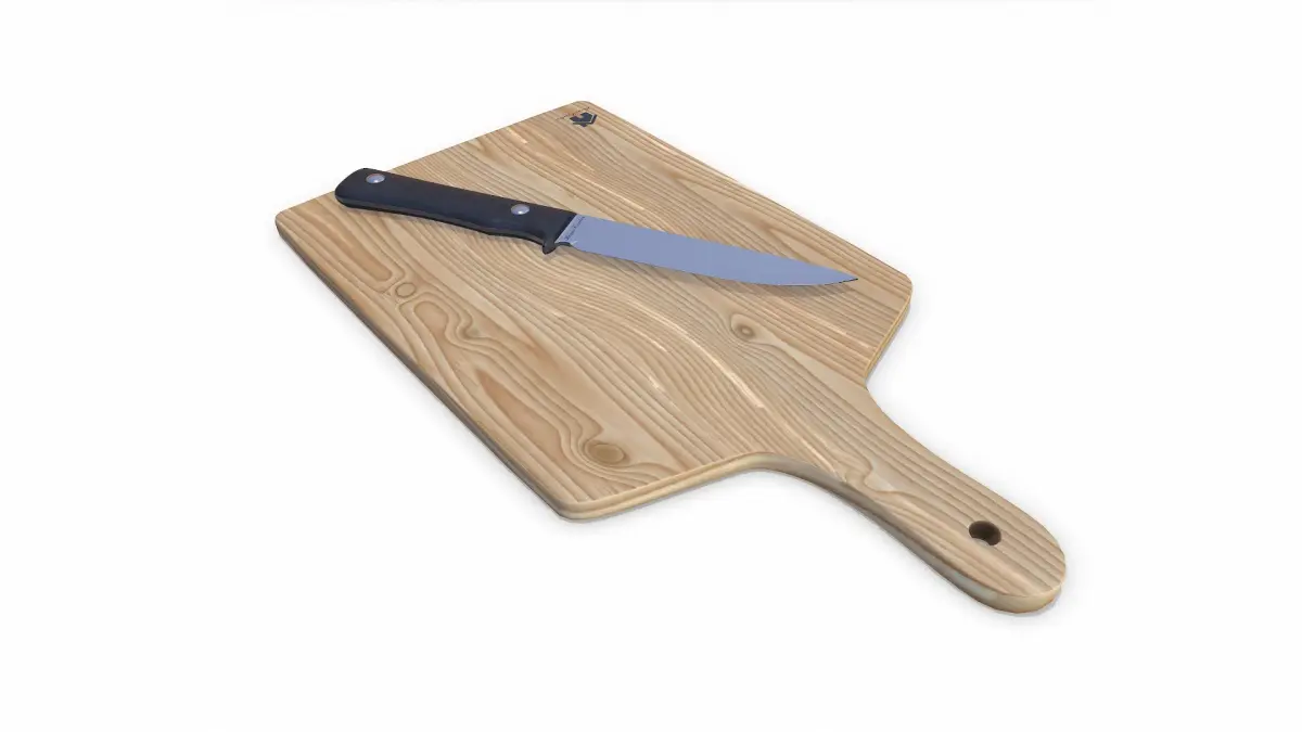 Wooden Cutting Board With Kinfe, Polygons: 3,504(7,008tris) Vertices: 3,574